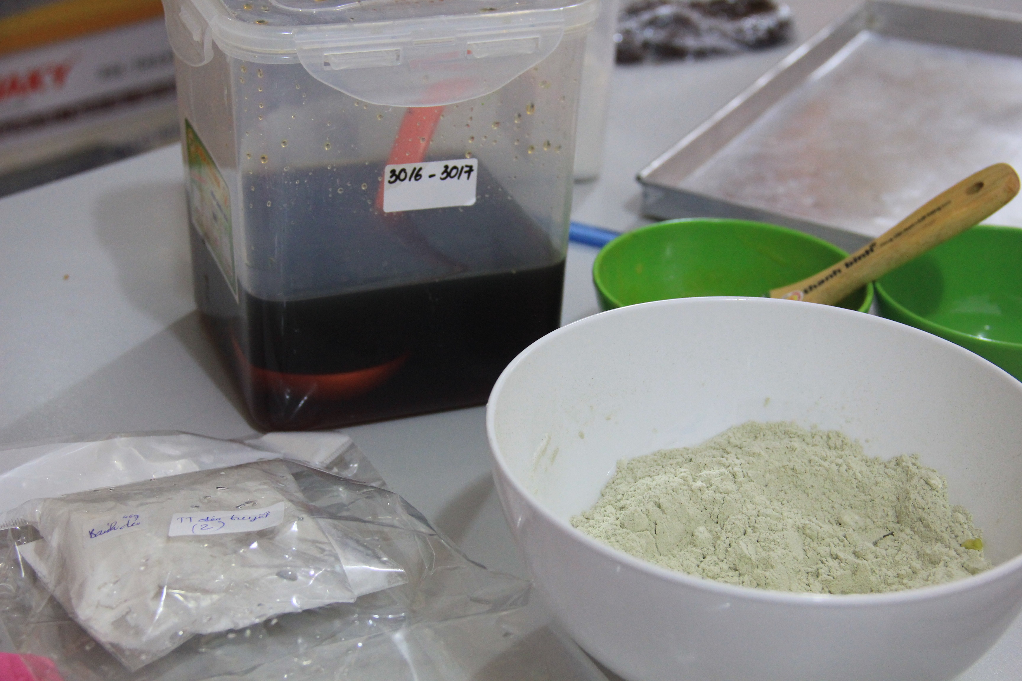 Nguyên liệu làm bánh khá cầu kỳ. Vy Tuấn Anh - chủ quán - cho biết, để bánh cho màu đẹp, cần phải chuẩn bị nước đường từ hơn 6 tháng trước. Ngoài ra, bột và màu, nhân bánh phải chuẩn bị kỹ lưỡng.