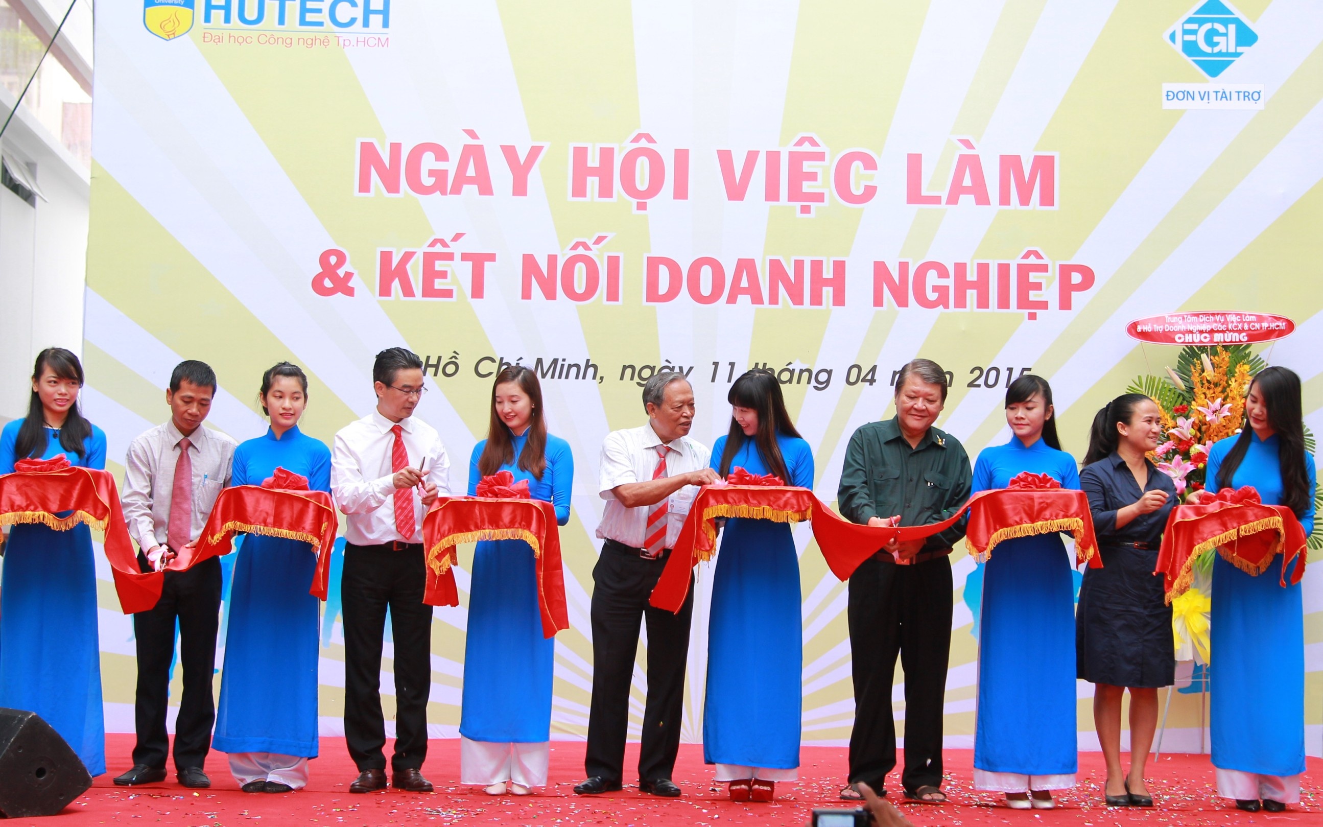 | Cắt băng khai mạc Ngày hội việc làm và kết nối doanh nghiệp HUTECH 2015. |