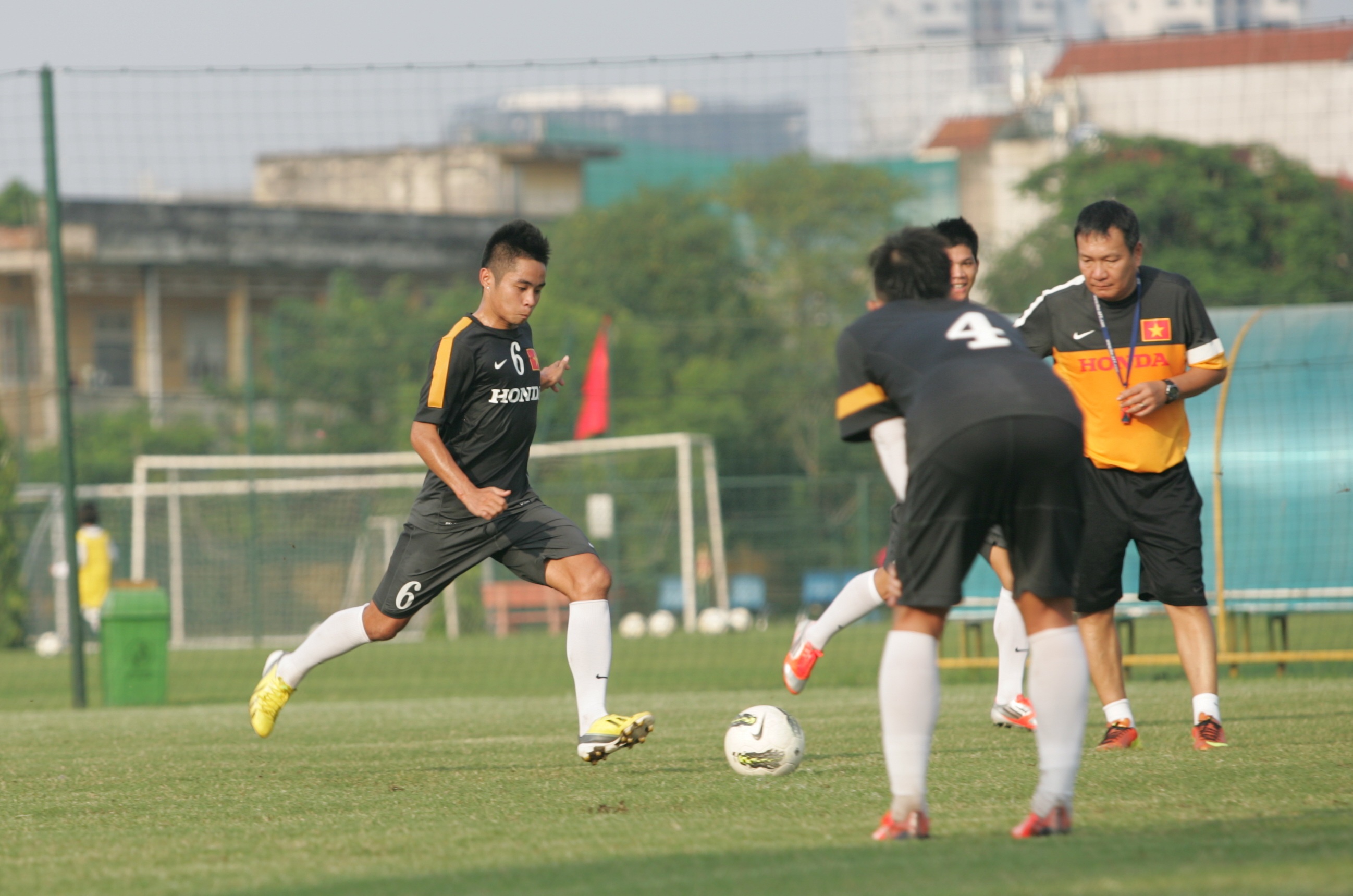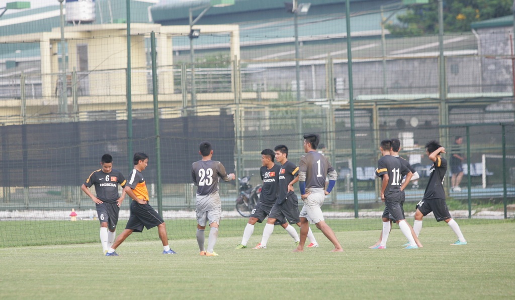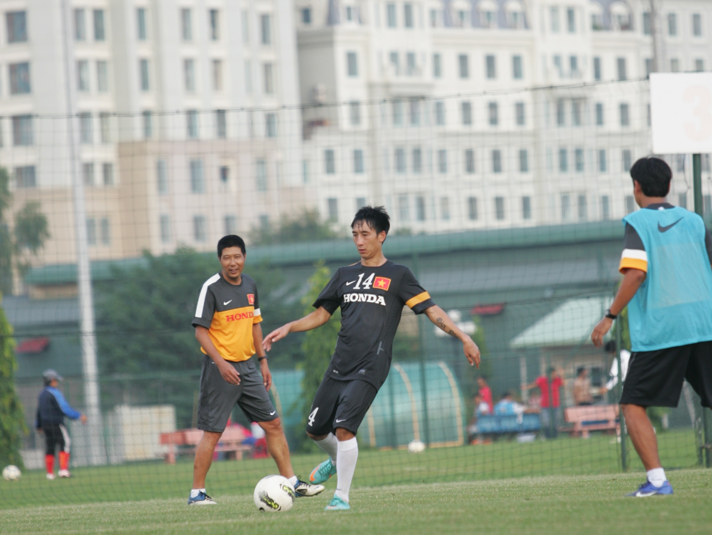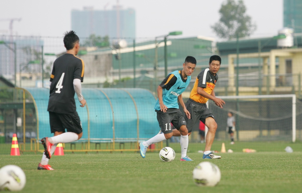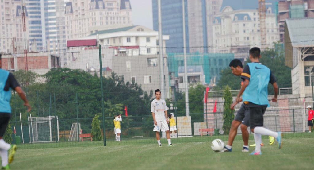 | Đội trưởng Văn Quyết của U23 Việt Nam tranh thủ thời gian nghỉ giải lao ở CLB Hà Nội T&T sang xem các đồng đội tập luyện. |