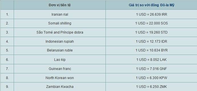 9. Kwacha (Zambia) Năm 1968, khi ra đời để thay thế cho đồng Zambian Pound, 1,2 Kwacha có giá trị tương đương với 1 đôla Mỹ. Con số nói trên được cho là vô cùng ấn tượng. Tuy nhiên càng về sau, giá trị của đơn vị tiền tệ này càng tụt dốc không phanh so với đồng bạc xanh. Bắt đầu từ tháng 1/2013, Zambia tái cơ cấu lại đồng tiền của mình, bên cạnh đó cũng thay đổi mã giao dịch của đồng Kwacha từ ZMK thành ZMW. Xem thêm: Những điều ít biết về các loại tiền Việt Nam |