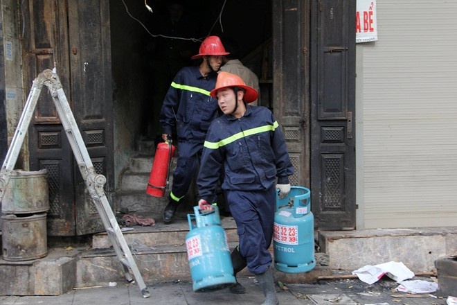 | 6 bình gas, 2 can xăng 20 lít, 2 can xăng 2 lít được lực lượng PCCC thu dọn khỏi căn phòng gia đình ông Bùi Tiến Dũng tại căn hộ số 61B Lò Sũ (Hoàn Kiếm, Hà Nội). Ảnh: Hoàn Nguyễn. |