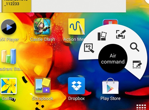2. Bảng điều khiển Air Command: Đây là phím tắt cho một số tính năng mới của S Pen. Để kích hoạt, người dùng chỉ cần rút cây bút ra khỏi máy, thiết bị sẽ hiện ra cửa sổ Air Command với các thao tác lệnh: Action Memo, Scrap Booker, Screen Write, S Finder và Pen Window.