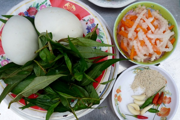 Bánh bèo ở Phan Thiết nhỏ xinh như chiếc nắp chai, nhưng dày, béo. Bánh thường được ăn kết hợp cùng bột đậu xanh, tóp mỡ, hành, tôm, thịt rim và nước mắm pha đậm đà. |