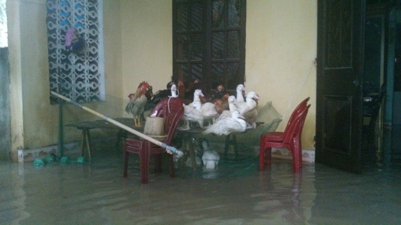 | Nước ngập sâu khiến nhiều gia súc, gia cầm của người dân bị lũ cuốn trôi, đời sống người dân đang rất khó khăn. |
