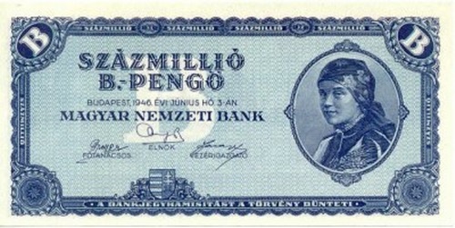 Tỷ lệ lạm phát: 207% Thời gian giá hàng hóa tăng gấp đôi: 15 giờ Gánh chịu sự tổn thất kinh tế bởi chiến tranh thế giới II, 40% ngân quỹ của Hungary đã bị phá hủy. Ngoài ra, cũng thời điểm, nước này còn việc vướng tai tiếng “quỵt” khoản nợ nhiên liệu trong sản xuất. Khi Hungary kí hiệp ước hòa bình với quân Đồng minh vào năm 1945, nước này bị yêu cầu trả một khoản bồi thường khổng lồ cho Liên Xô, ước tính vào khoảng 25 - 50% ngân sách của nhà nước Hungary trong suốt thời kì siêu lạm phát. Trong khi đó, chính sách tiền tệ cũng đã đồng thời được lựa chọn bởi Ủy ban kiểm soát Đồng minh. Các ngân hàng trung tâm Hungary cảnh báo rằng việc in tiền để trả hóa đơn sẽ không có kết thúc tốt đẹp, nhưng Xô Viết, nơi từng cai quản ủy ban kiểm soát cũng đã bỏ qua những lời cảnh báo này dẫn tới một số kết luận rằng lạm phát phi mã được tạo nên để nhằm mục tiêu chính trị, mục tiêu nhằm phá hủy tầng lớp trung lưu. |