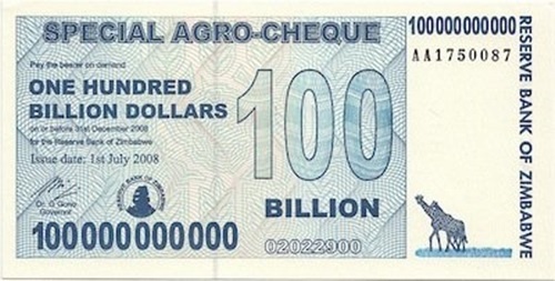 Tỷ lệ lạm phát: 98% Thời gian giá hàng hóa tăng gấp đôi: 25 giờ Lạm phát phi mã của Zimbabwe xảy ra trong khoảng thời gian dài trước việc sụt giảm nhanh chóng sản lượng hàng hóa được tiếp nối bởi cuộc cải cách ở vùng Robert Mugabenawm 2000-2001. Thông qua đó, phần lớn đất đai đã bị thu hồi từ người dân da trắng và phân phối lại cho dân da đen. Viêc làm này dẫn tới sự phá giá 50% sản lượng trong vòng 9 năm tiếp theo. Những cuộc cải cách chủ nghĩa xã hội và sự tốn kém khi tham gia cuộc nội chiến Congo đã dẫn tới sự thâm hụt ngân sách quá mức của chính phủ. Cùng lúc đó, dân số Zimbabwe cũng giảm mạnh vì phải chạy trốn. Hai yếu tố đối lập là việc tăng tiêu dùng chính phủ và giảm cơ sở thuế đã khiến chính phủ phải sự dụng biện pháp lưu thông tiền để đối phó với tình trạng thâm hụt ngân sách này. |