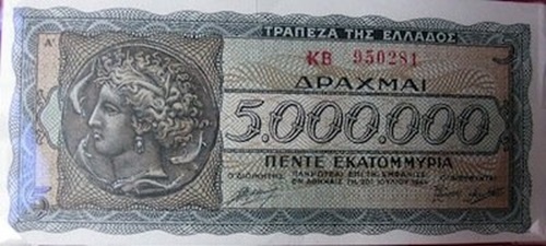 Tỷ lệ lạm phát: 18% Thời gian giá hàng hóa tăng gấp đôi: 4 ngày, 6 giờ Cân bằng ngân sách của Hy Lạp đã chuyển từ thặng dư 271 triệu drachma năm 1939 thành thiếu hụt 790 triệu drachma vào năm 1940 do sự bùng nổ của chiến tranh thế giới II ( Ngoại thương đã sụt giảm đáng kể). Điều này đã tạo tiền đề cho một vị trí tài chính trở nên xấu đi khi Hy Lạp bị xâm lược bởi các cường quốc trong phe Trục vào cuối năm 1940. Những chi phí thêm của Hy Lạp đã bị lợi dụng bởi các “chính phủ bù nhìn” của phe Trục, thứ đã kiểm soát nước này suốt thời gian chiếm đóng của nó, trong đó bao gồm hỗ trợ đồn trú cho 400.000 binh lính của phe Trục, và một khoản tiền bồi thường lớn cho những kẻ chiếm đóng. Hơn nữa. thu nhập quốc gia của Hy Lạp đã giảm từ 67,4 tỷ drachma năm 1938 xuống còn 20 tỷ drachma vào năm 1942. Bởi vì doanh thu từ thuế cũng giảm mạnh, Hy Lạp phải sử dụng đến biện pháp lưu thông tiền tại các ngân hàng trung ương để trả cho các khoản nợ nói trên và bù đắp phần thâm hụt ngân sách. |