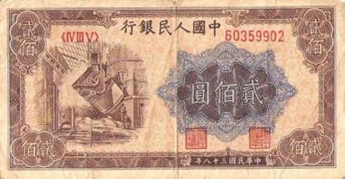 Tỷ lệ lạm phát: 14% Thời gian giá hàng hóa tăng gấp đôi: 5 ngày, 8 giờ Sau chiến tranh thế giới II, Trung Quốc bị chia cắt bởi cuộc nội chiến. Phe Xã hội chủ nghĩa và phe Cộng sản đã đấu tranh để giành quyền lãnh đạo đất nước và cạnh tranh với nhau cho ra mắt đồng tiền của mình trong quá trình này. Việc này đã để lại cho Trung Quốc một hệ thống tiền tệ bị phá vỡ giữa mười phương tiện trao đổi chính vào năm 1948. Đồng tiền trở thành tâm điểm của cuộc xung đột, Campebell và Tullock đã giải thích rằng ba chính phủ (bao gồm cả quân xâm lược Nhật Bản) đã tham gia vào “cuộc chiến tranh tiền tệ” bằng việc cố gắng làm suy yếu đồng tiền đối phương theo nhiều cách. Để chi viện cho cuộc chiến, phe Xã hội chủ nghĩa đã phải viện cớ thâm hụt ngân sách vì họ phải trang trải cho việc in tiền, điều này khiến gây ra tình trạng lạm phát phi mã. Điều này bắt đầu bởi việc bỏ qua tiêu chuẩn bạc ở Trung Quốc vào năm 1935. Họ thậ chí cong lôi kéo ngân hàng trung ương của Đài Loan liên quan vào việc lưu hành tiền tệ, việc làm này đã gây ra tình trạng lạm phát phi mã cả ở Đài Loan. |