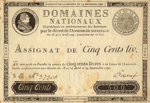 Tỷ lệ lạm phát: 5% Thời gian giá hàng hóa tăng gấp đôi: 15 ngày, 2 giờ Cuộc cách mạng của nước Pháp (1789-1799) đã xảy ra sau giai đoạn nước Pháp vướng vào khoản nợ từ những cuộc chiến tranh, trong đó có cuộc chiến tranh giành độc lập cho Mỹ từ nước Anh. Một trong những chính sách kinh tế chính của cuộc cách mạng Pháp là quốc hữu hóa ruộng đất trước kia thuộc sở hữu của Giáo hội Công giáo. Giáo hội được xem là mục tiêu dễ dàng nhất cho việc tước quyền sở hữu tài sản bởi vì họ sở hữu rất nhiều ruộng đất nhưng có ảnh hưởng chính trị tương đối ít trong hệ thống cai trị mới. Chính phủ đã phát hành các assignat cho công chúng (một loại tiền giấy của Pháp), có nghĩa cứ mỗi tờ assignat là tương ứng một mảnh đất, đây được xem là cách có thể giải cứu cho những người nắm giữ tờ tiền này trong tương lai. Tuy nhiên, chính phủ đã kết thúc cách phát hành quá nhiều loại tiền này với nỗ lực chấm dứt sự thiếu hụt ngân sách, sự mất giá của đồng assignat và kết cục đã khiến đất nước rơi vào siêu lạm phát. |