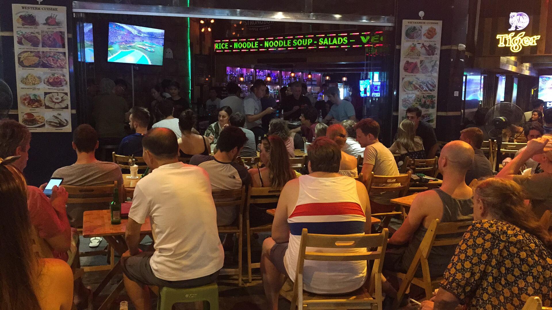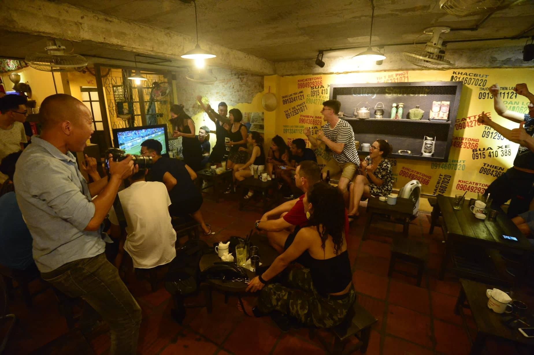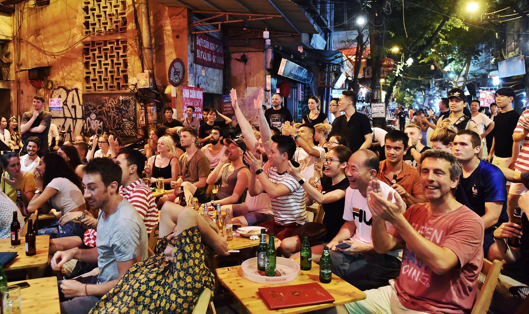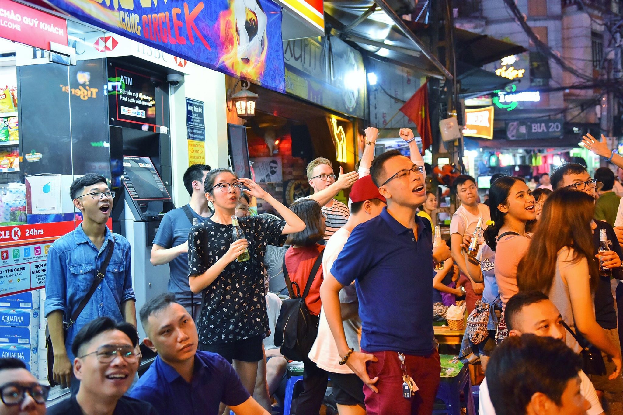 | Phố có nhiều người nước ngoài tụ tập như Tạ Hiện, Lương Ngọc Quyến không còn chỗ trống. Nhiều khách phải ngồi tràn ra vỉa hè để ngồi xem bóng đá. |