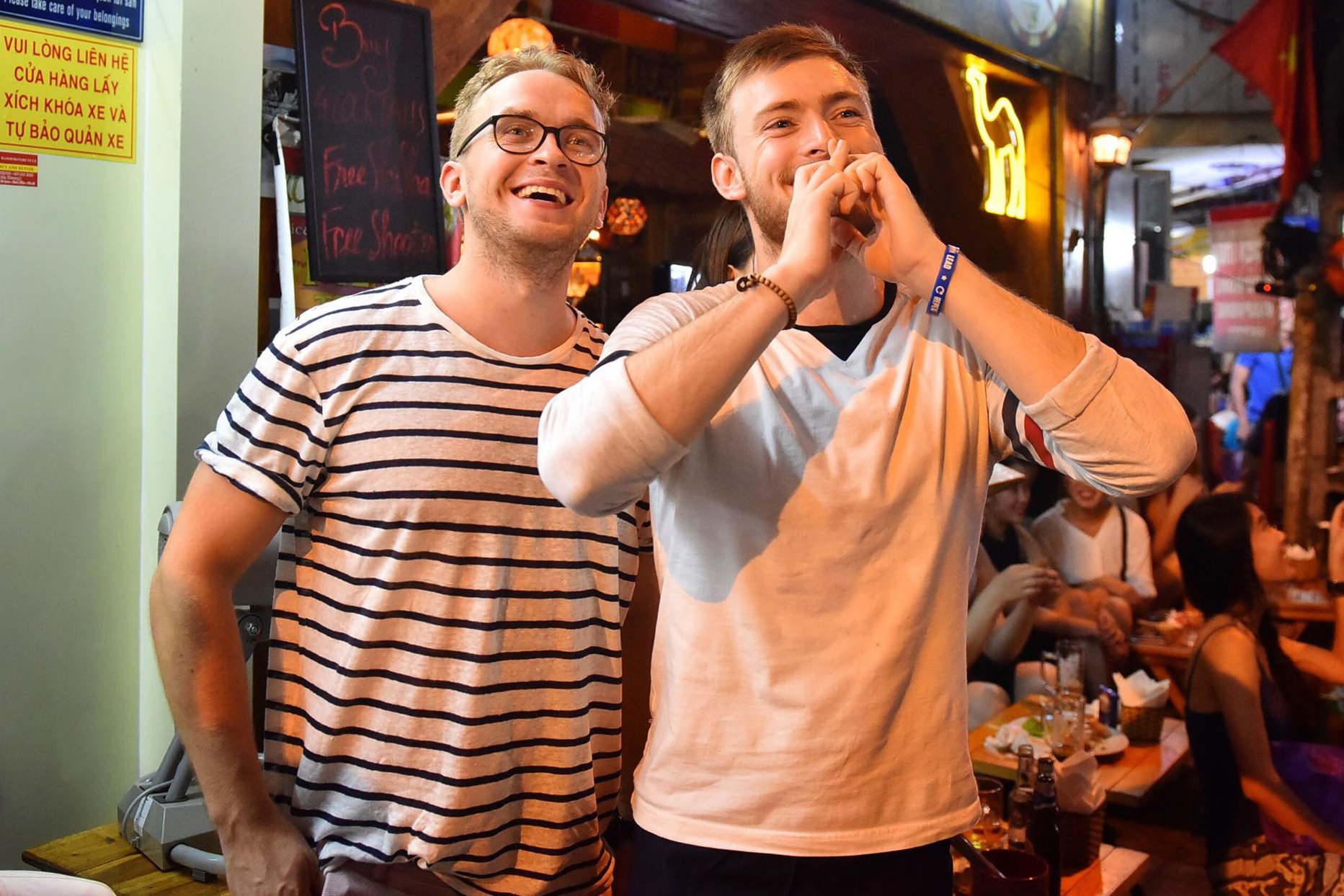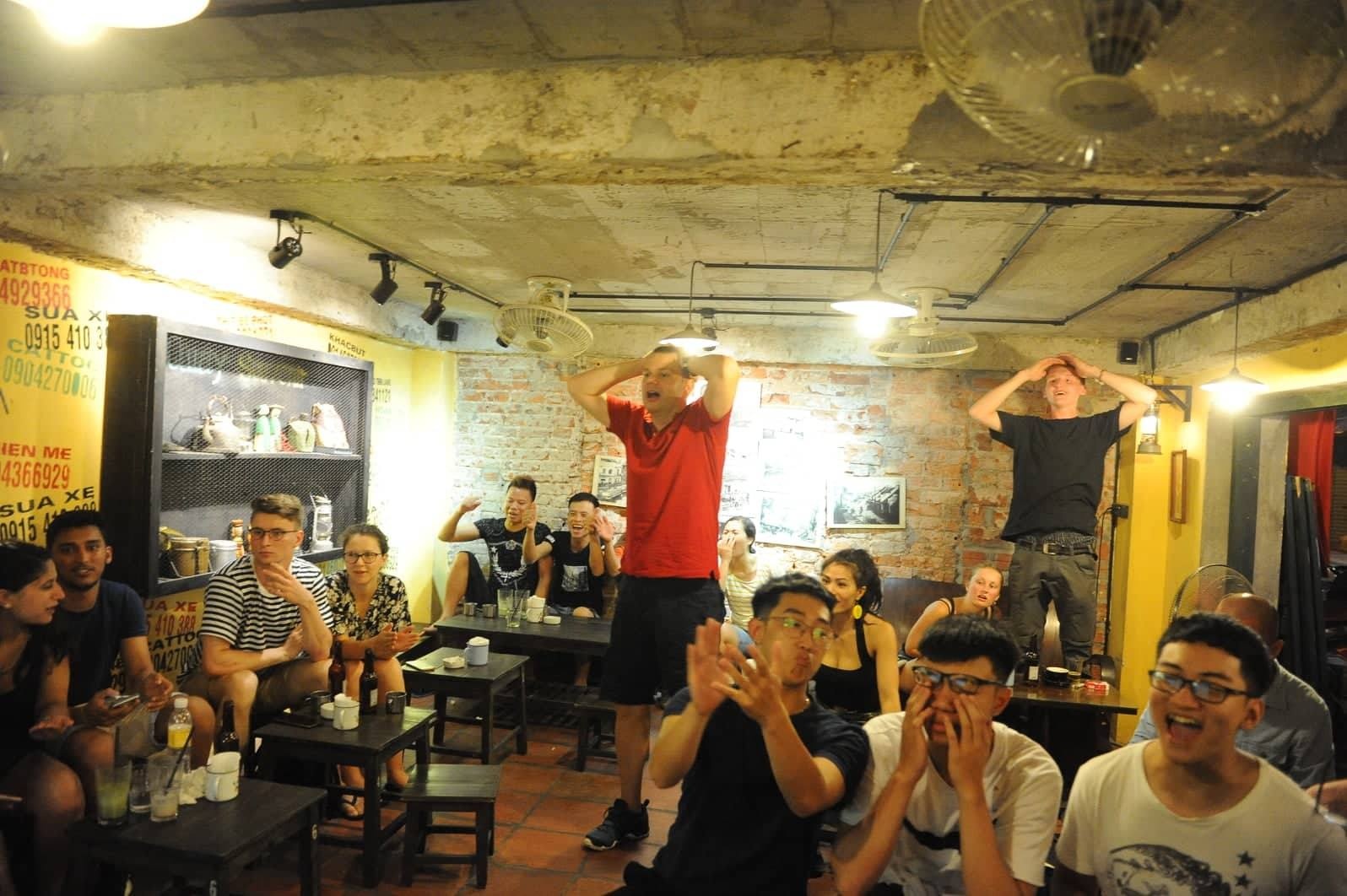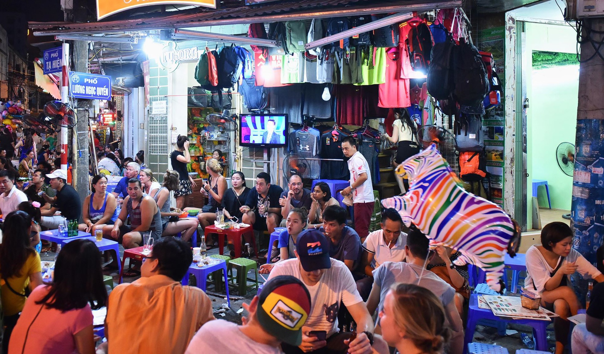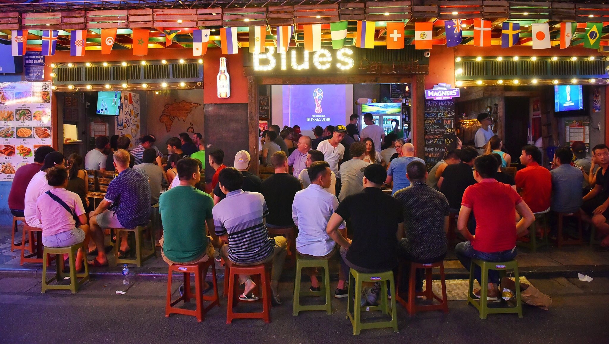 | Phố có nhiều người nước ngoài tụ tập như Tạ Hiện, Lương Ngọc Quyến không còn chỗ trống. Nhiều khách phải ngồi tràn ra vỉa hè để ngồi xem bóng đá. |