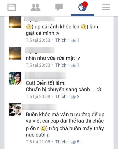 "Buồn thì khóc, vui thì cười, em luôn sống chân thật với chính mình, tại sao mọi người cứ thích chế giễu những cảm xúc riêng tư như thế. Em không hề trả vờ khóc để chụp ảnh khoe mọi người, thực sự, em đang rất yếu đuối. Tuy nhiên, em đang cố đưa mọi chuyện vào lãng quên" - 9X chia sẻ.