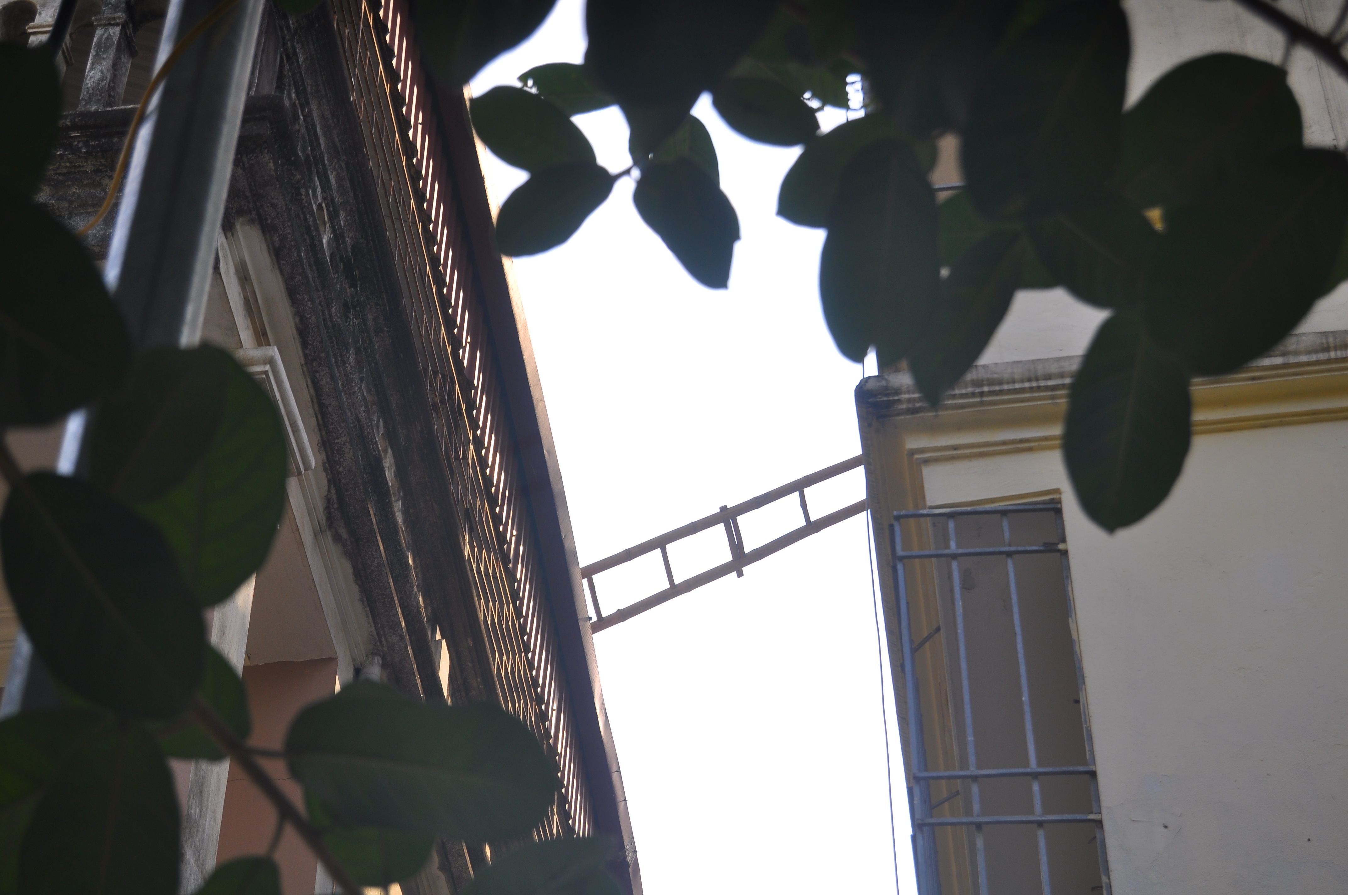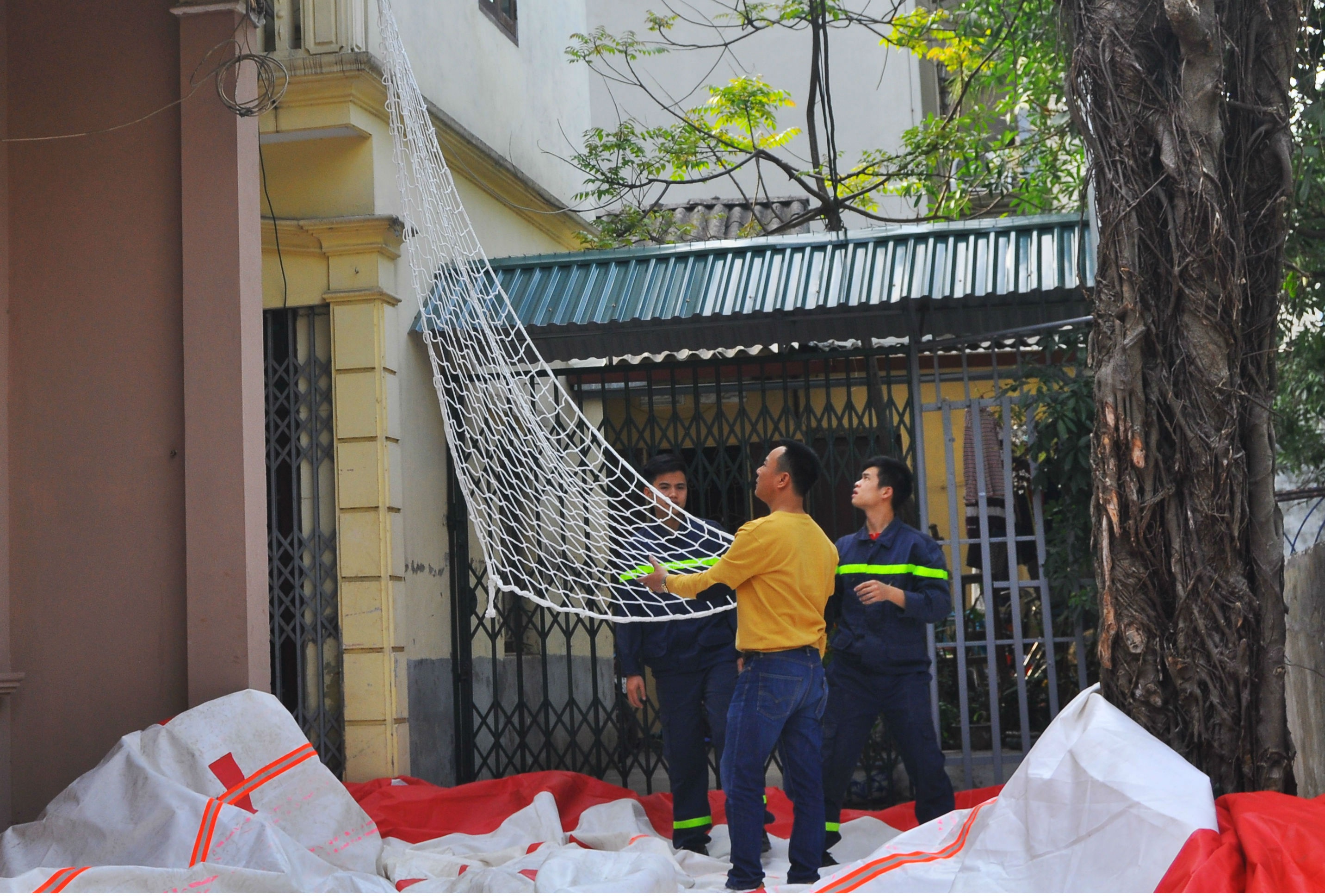 | Cảnh sát PCCC quận Hoàng Mai đổi phương án căng lưới quanh ngõ đề phòng 9X nhảy xuống. |