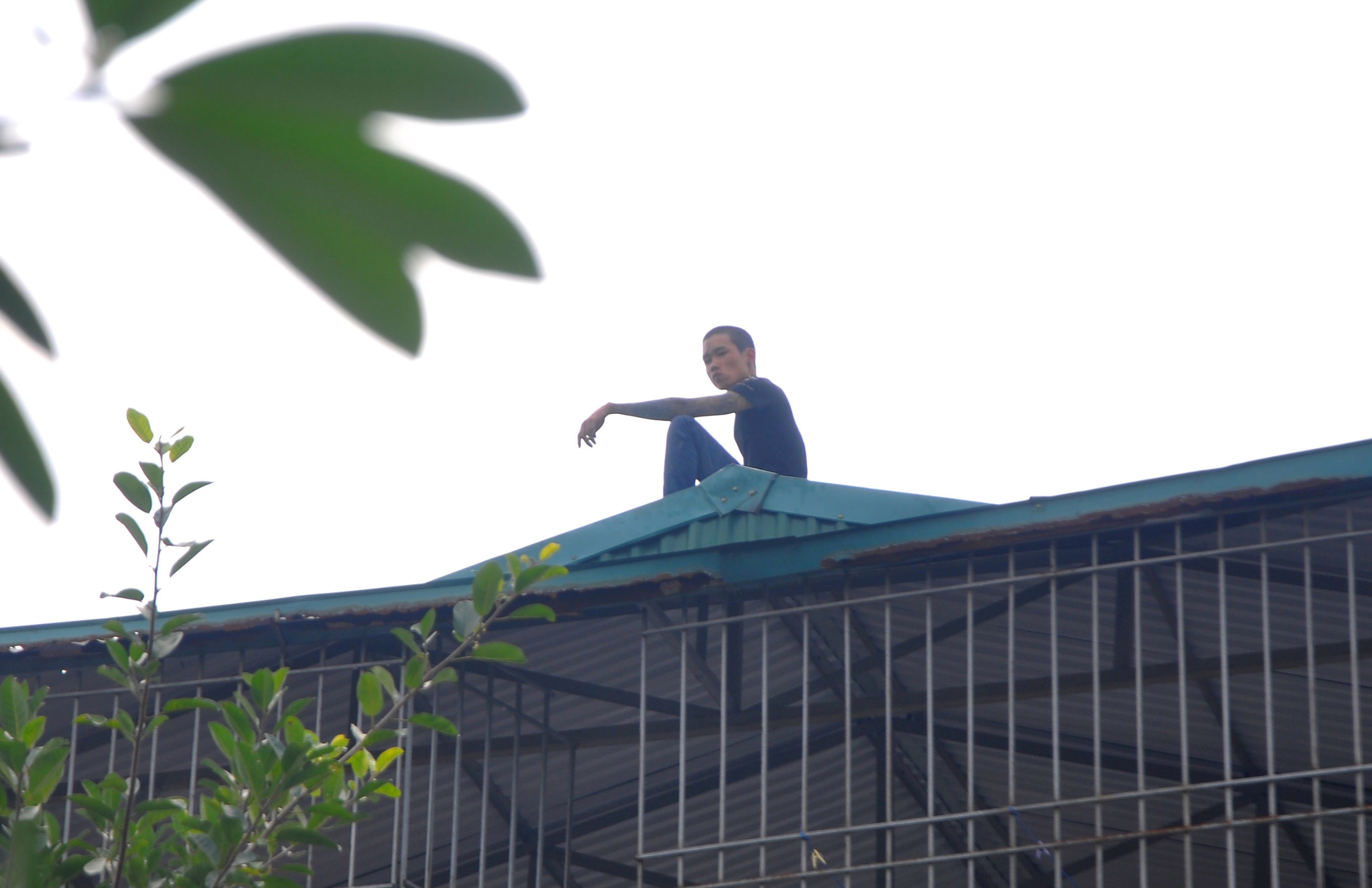 Trưa 28/2, Trưởng công an quận Hoàng Mai, đại tá Nguyễn Hồng Thái, trực tiếp xuống hiện huy động hàng chục cán bộ bắc thang nối giữa hai mái nhà giải cứu nhưng người này vẫn bất hợp tác. Nhiều người thân được cảnh sát mời đến khuyên nhủ nhưng anh ta không nhận ra ai. Thanh niên này còn tháo đinh vít trên mái liên tiếp ném về phía bố, chú ruột sau đó đòi cầm dao tự vệ. |