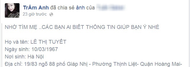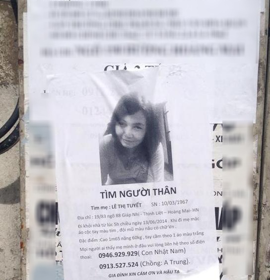Ngày 13/6, bà Lê Thị Tuyết (sinh năm 1967), ngụ tại địa chỉ 19/83 ngõ 88 phố Giáp Nhị, hường Thịnh Liệt, Quận Hoàng Mai, Hà nội, ra ngoài không thấy trở về. Sau nhiều ngày tìm kiếm không có kết quả, Nhật Nam, con trai bà Tuyết đã nhờ cộng đồng mạng lan truyền thông này với hi vọng sớm tìm thấy mẹ.