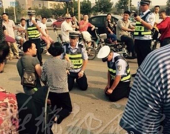 | Mạng Weibo Trung Quốc chia sẻ hình ảnh hai cảnh sát quỳ gối trước người vi phạm luật giao thông gây xôn xao dư luận nước này. Ảnh được ghi lại vào trưa ngày 28/8 tại thành phố Hàm Đan. Theo đó, một thanh niên đã bị cảnh sát giữ lại do uống rượu khi lưu thông trên đường. Mẹ chàng trai quỳ gối, xin cảnh sát bỏ qua. Thấy vậy, hai người cũng quỳ xuống và giải thích cho họ hiểu. Câu chuyện này cũng nhanh chóng được cộng đồng mạng Việt quan tâm với hơn 15.000 lượt xem. Ảnh: Weibo. |