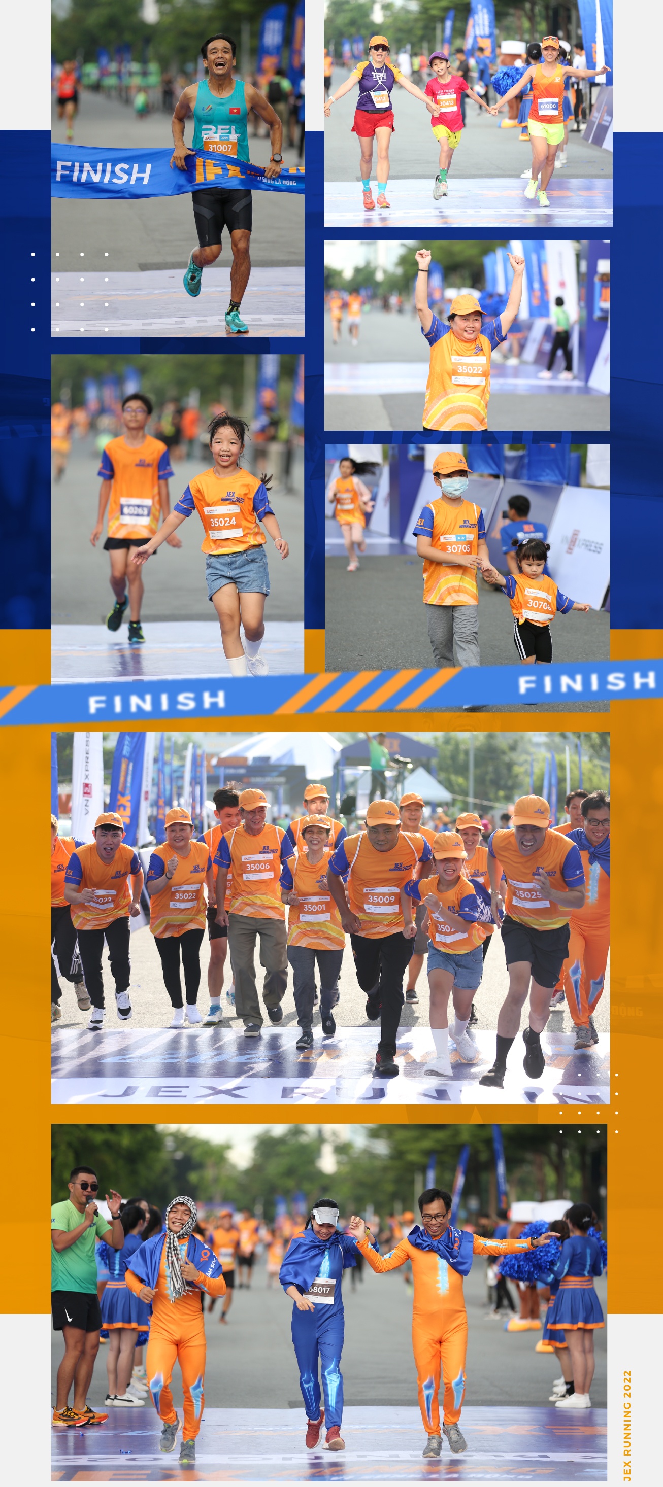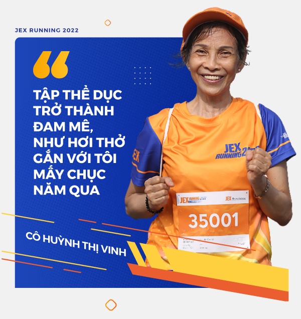 Vóc dáng nhỏ nhắn, mái tóc điểm hoa râm, cô Huỳnh Thị Vinh hứng khởi chạm vạch đích Jex Running 2022. Đây là giải chạy đầu tiên nữ giáo viên này tham gia. “Vui lắm. Vui không muốn về”, cô Vinh bày tỏ cảm xúc sau cung chạy 3 km vừa hoàn thành.