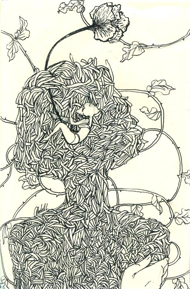 "Yêu một người mang nhiều tổn thương, đôi khi cũng giống như ôm một bó hồng chưa nhổ gai" là ý nghĩa của bức tranh mang đầy tính trừu tượng này.