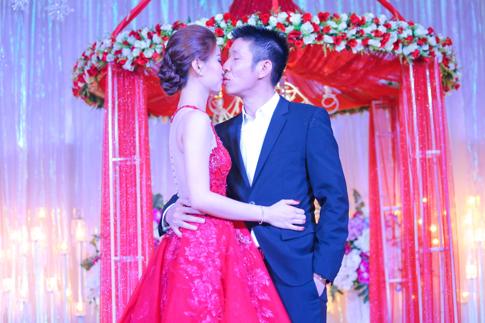 | Trước sự cổ vũ của bạn bè, khách mời, cô dâu chú rể trao nhau nụ hôn say đắm. |