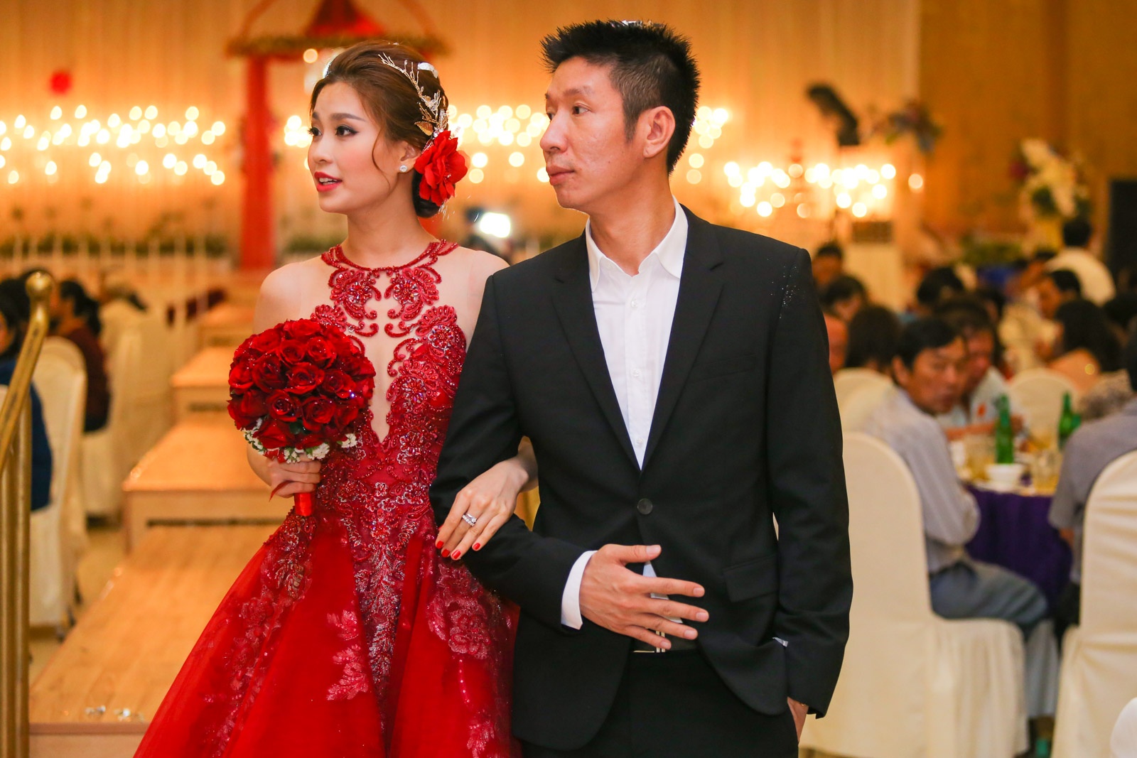 | Sau khi thay đổi trang phục, đôi vợ chồng son nhanh chóng di chuyển đến sảnh tiệc để đón khách mời, họ hàng, bà con lối xóm. Cô dâu sinh năm 1991 nổi bật trong thiết kế ren tông màu đỏ. Chú rể diện vest lịch lãm. |