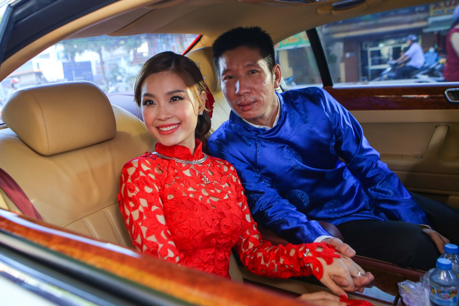 | Cặp tân lang, tân nương bước lên ô-tô di chuyển đến địa điểm đãi tiệc cưới ngay khi đám hỏi kết thúc lúc 17h ngày 24/12, tại tư gia nhà gái. |