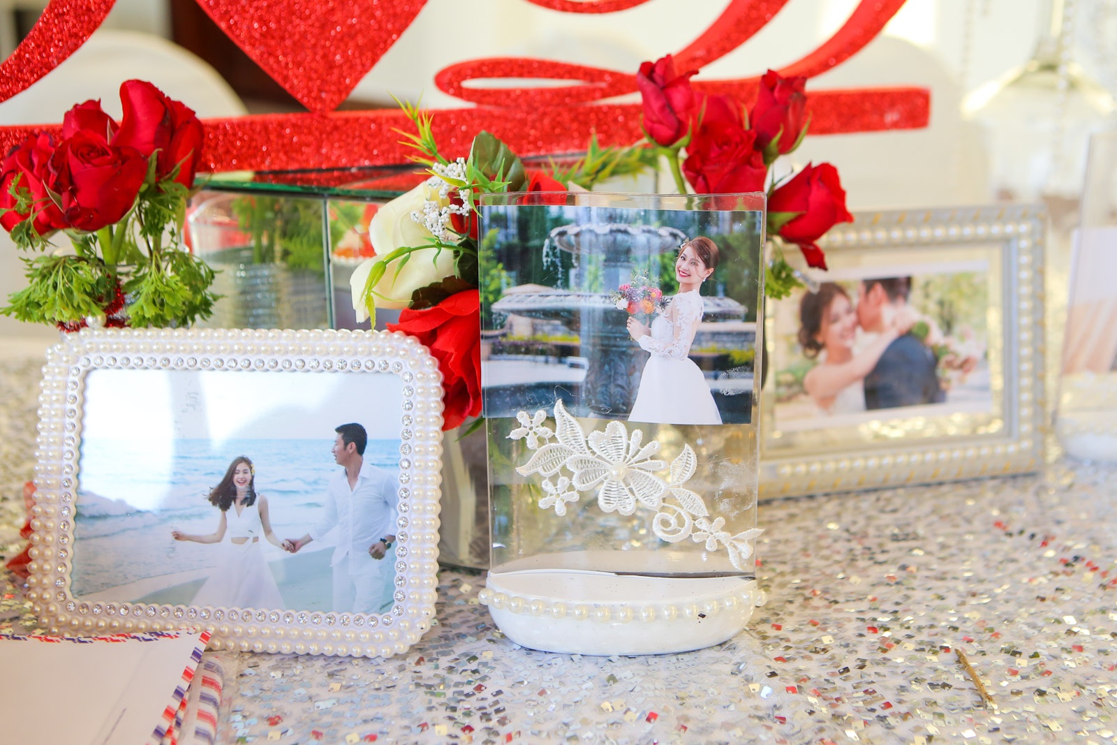 | Hôn lễ của Á hậu Việt Nam 2014 diễn ra tại khách sạn nằm ở trung tâm thành phố Vĩnh Long. Không gian tiệc được trang trí khá nhẹ nhàng bởi gam đỏ trắng làm chủ đạo. Ảnh cưới của cặp uyên ương được đặt trang trọng trên bàn đón khách. |