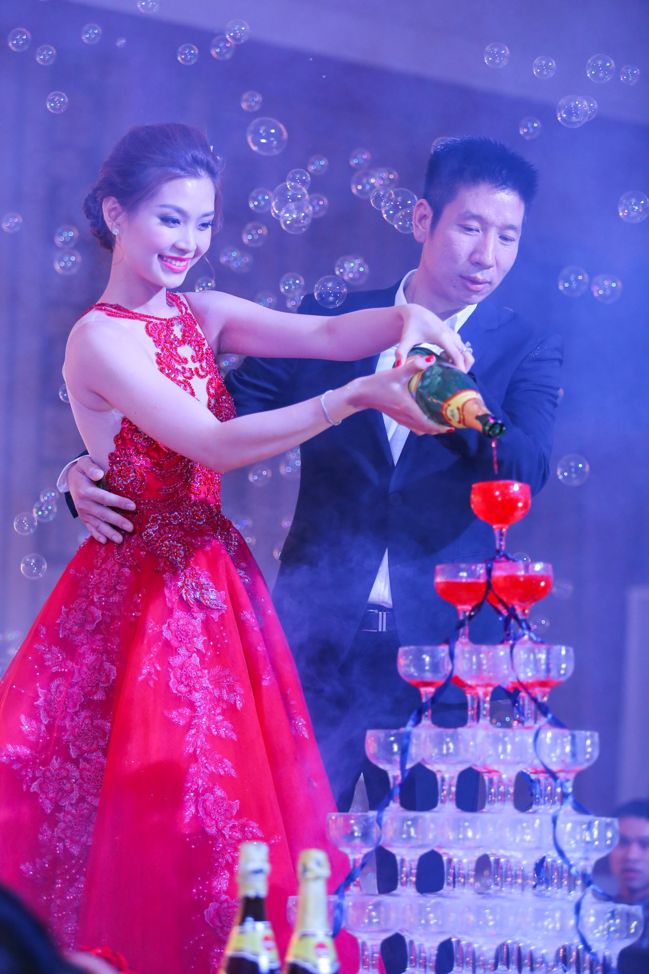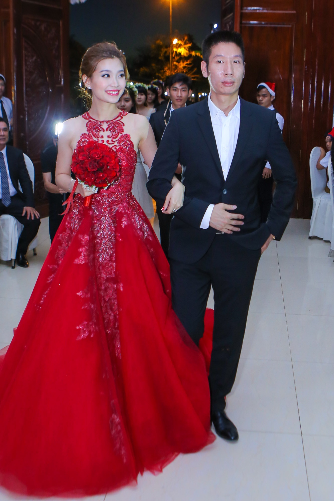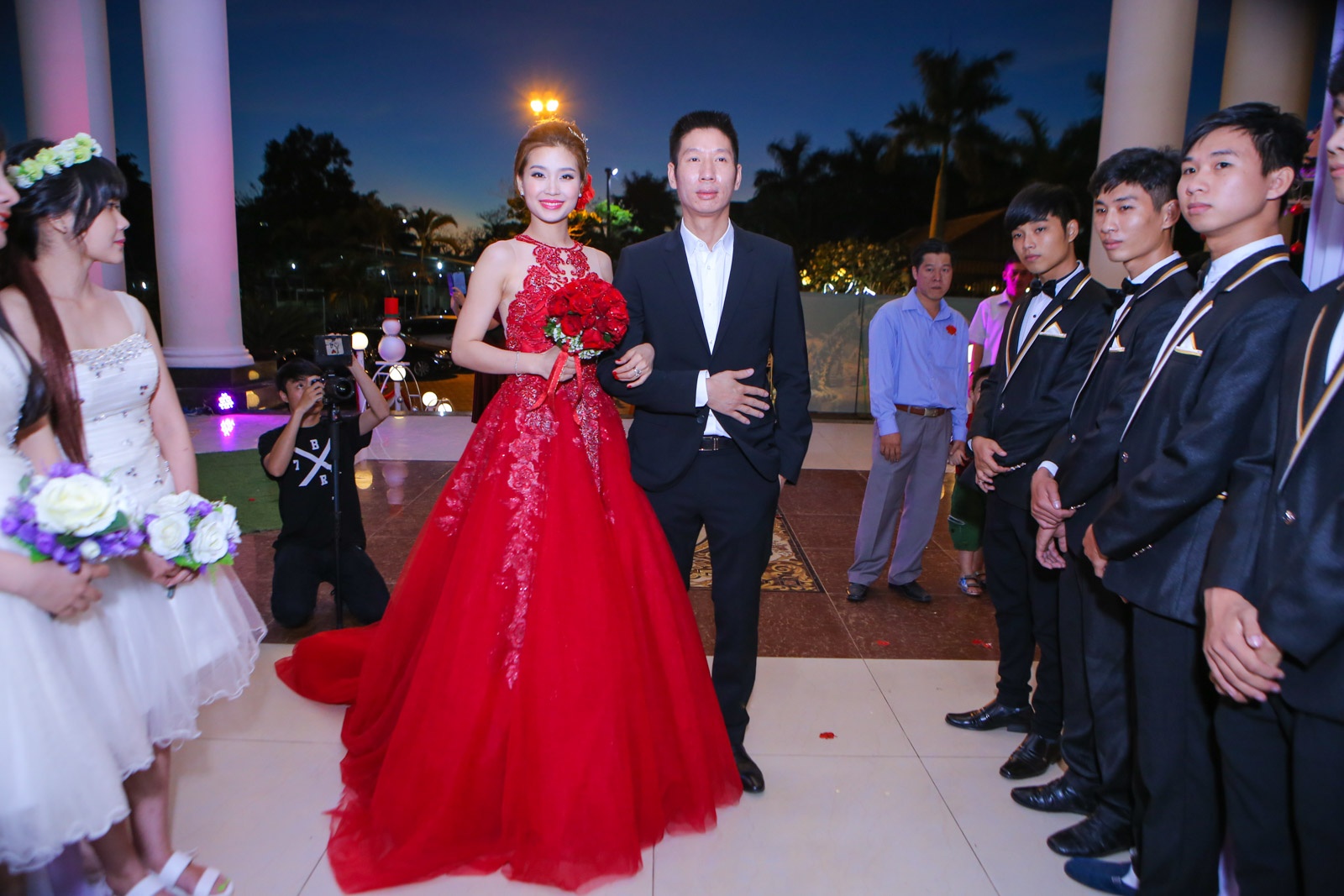 | Á hậu Việt Nam 2014 khoác tay chồng cùng tiến về sân khấu trong sự cổ vũ của bạn bè và hai họ. |