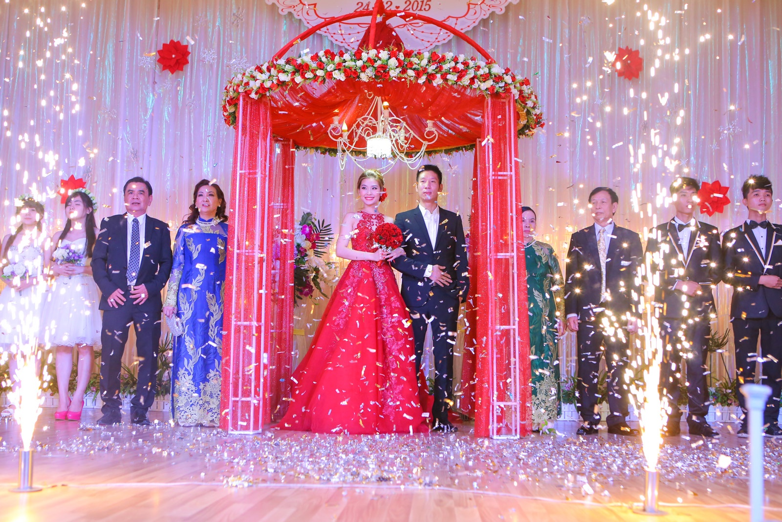 | Cô dâu chú rể cùng gia đình hai họ bước lên sân khấu tiệc cưới để gửi lời cám ơn đến khách mời, cũng như thông báo họ chính thức nên vợ nên chồng. |