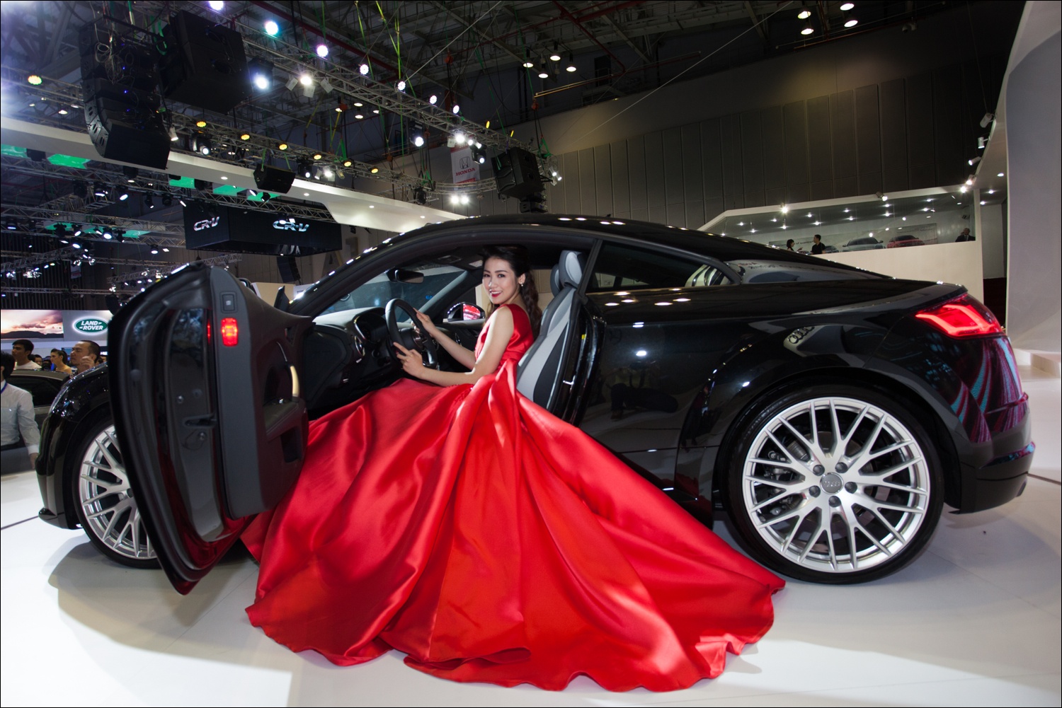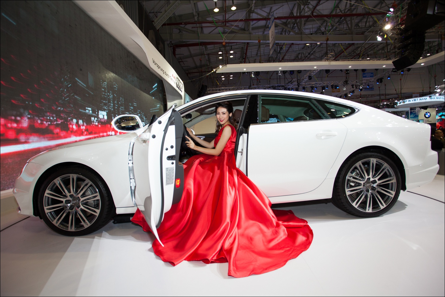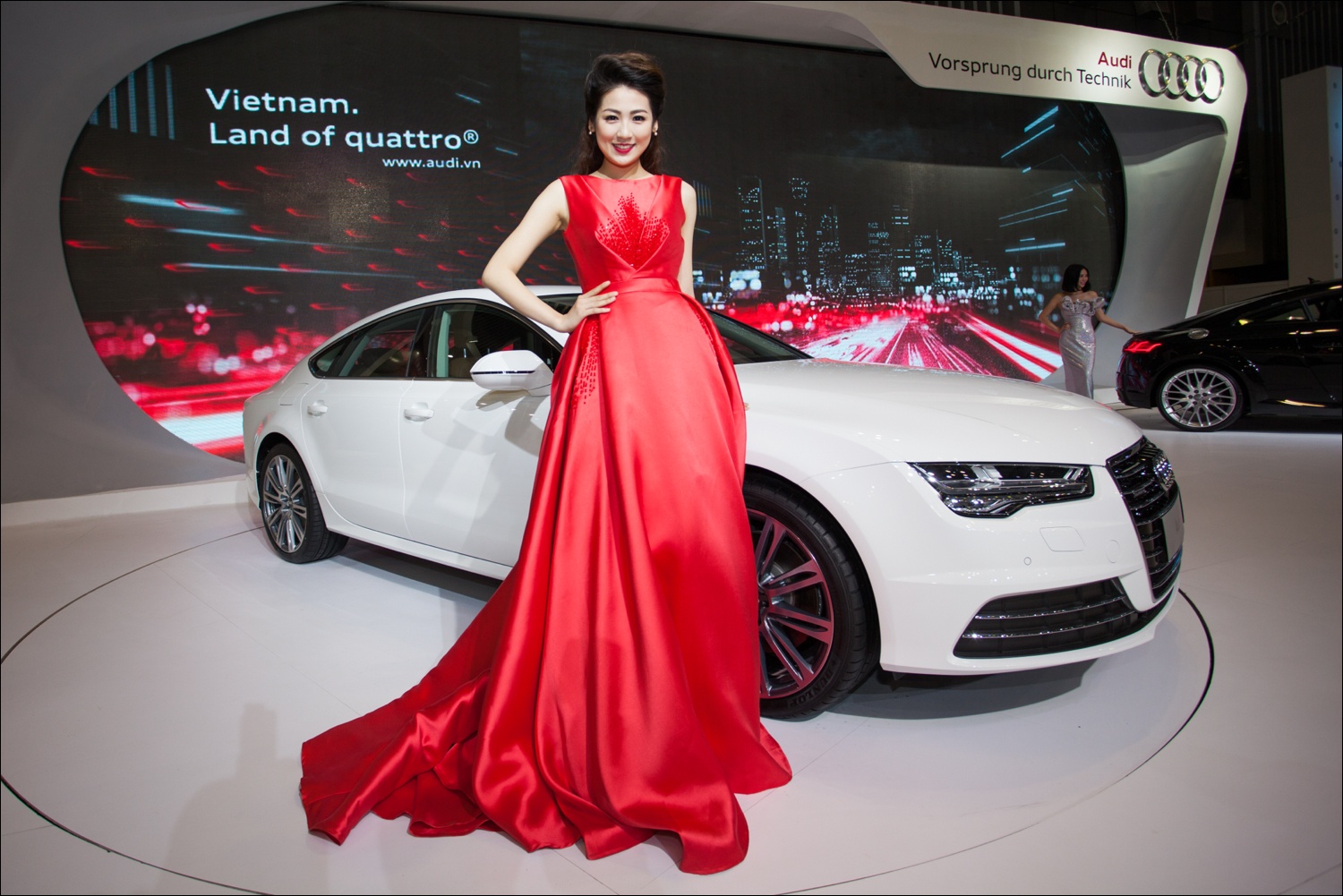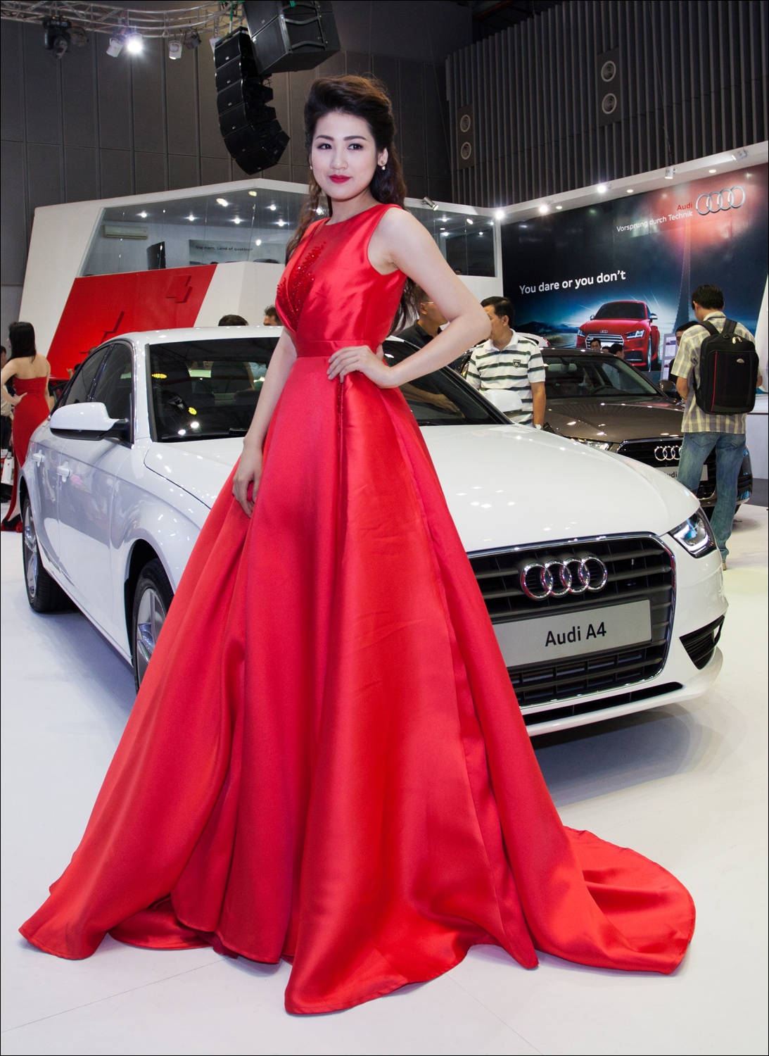 | Dương Tú Anh xuất hiện trong gian hàng Audi tại triển lãm Vietnam Motor Show 2014 với vai trò đại sứ dòng xe A4. |