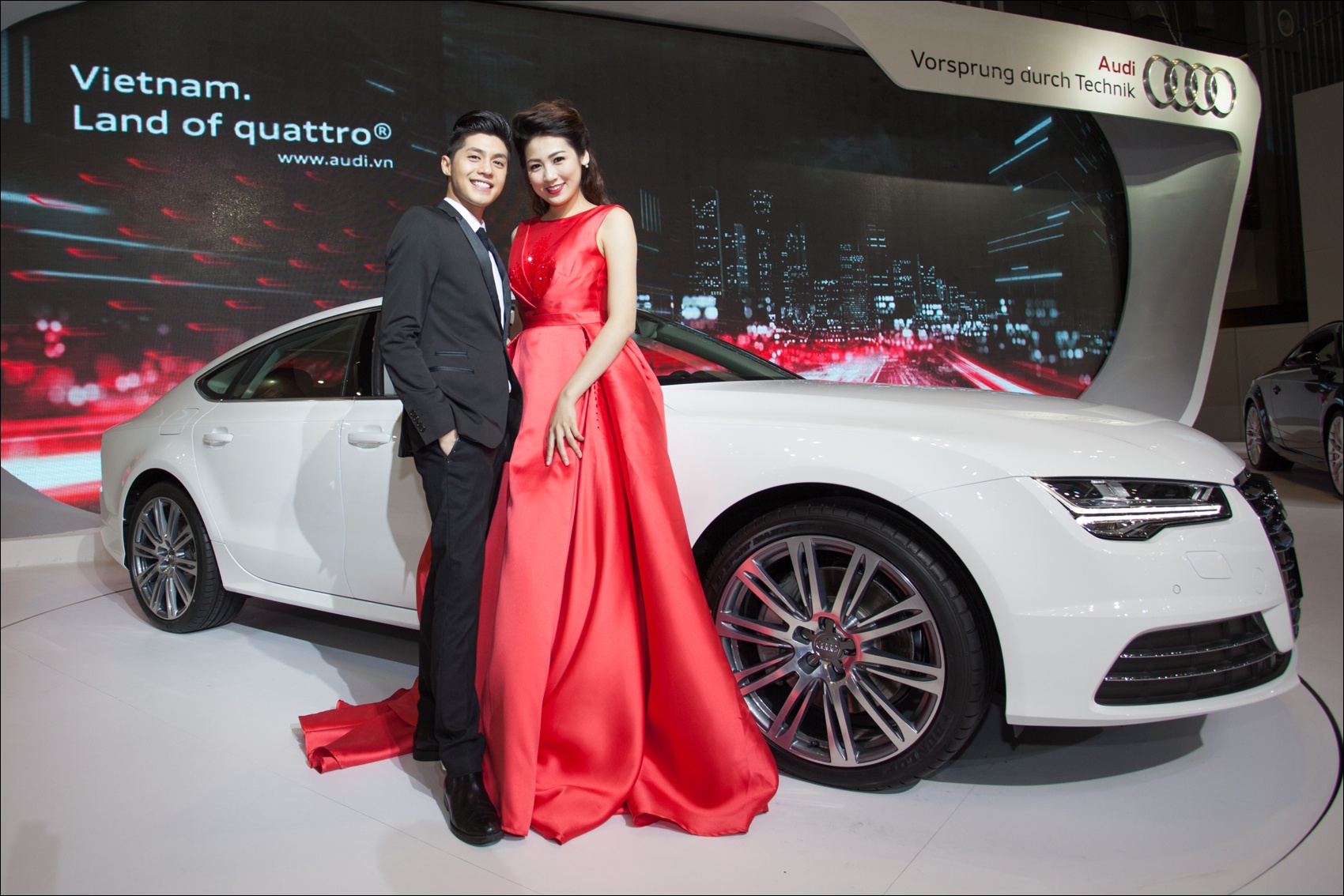 | Noo Phước Thịnh - đại sứ Audi A3 sedan cùng Dương Tú Anh bên chiếc A7 Sportback. |