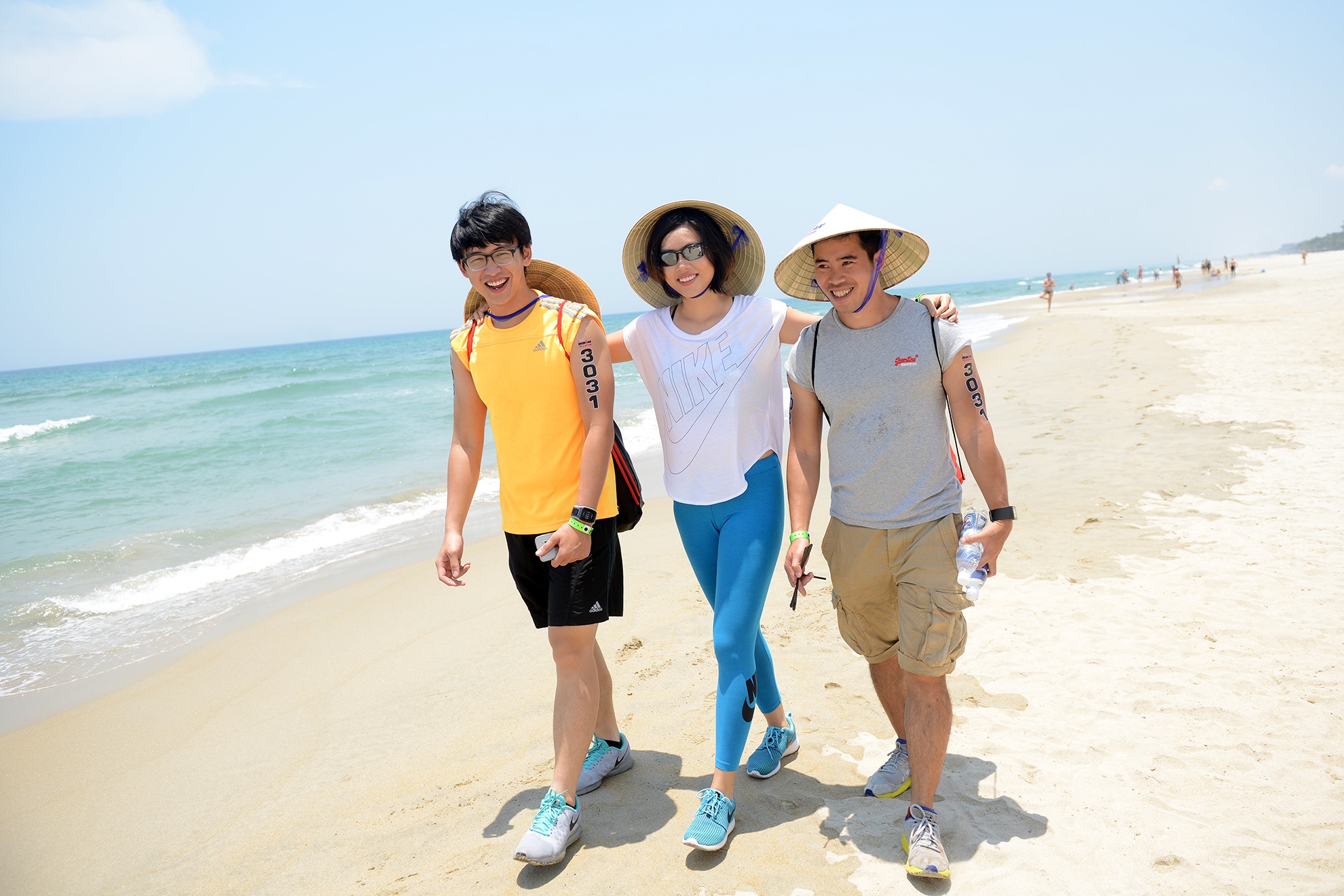 | Hoàng My cùng các đồng đội Nguyễn Ngọc Quang Bảo và Nguyễn Biên Thuỳ đi dạo bên bờ biển Đà Nẵng, kiểm tra đường đua xanh. Bơi sẽ là phần thi của Quang Bảo, chàng trai 25 tuổi từng là một vận động viên bơi lội chuyên nghiệp. |