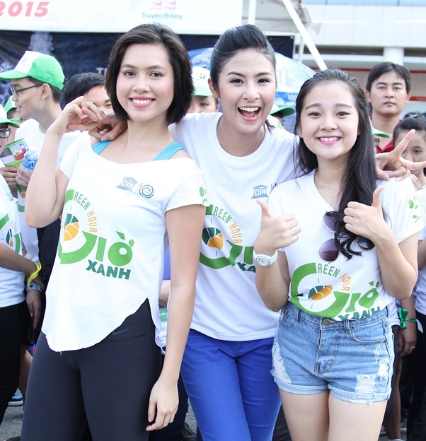 Á hậu Việt Nam 2010 lộ vóc dáng mũm mĩm khi tham gia hoạt động bảo vệ môi trường Giờ xanh cùng hoa hậu Ngọc Hân, diễn viên Tam Triều Dâng.