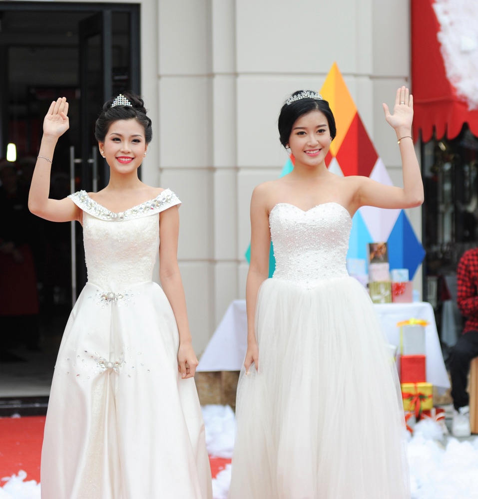 | Đây là lần đầu tiên á hậu 1 và á hậu 2 có dịp hội ngộ kể từ sau cuộc thi Hoa hậu Việt Nam 2014. Hai người đẹp không hẹn mà cùng diện bộ đầm màu trắng, phong cách công chúa tuyết yêu kiều. Á hậu Huyền My có phần gợi cảm hơn với thiết kế cúp ngực khoe vai trần cuốn hút. |
