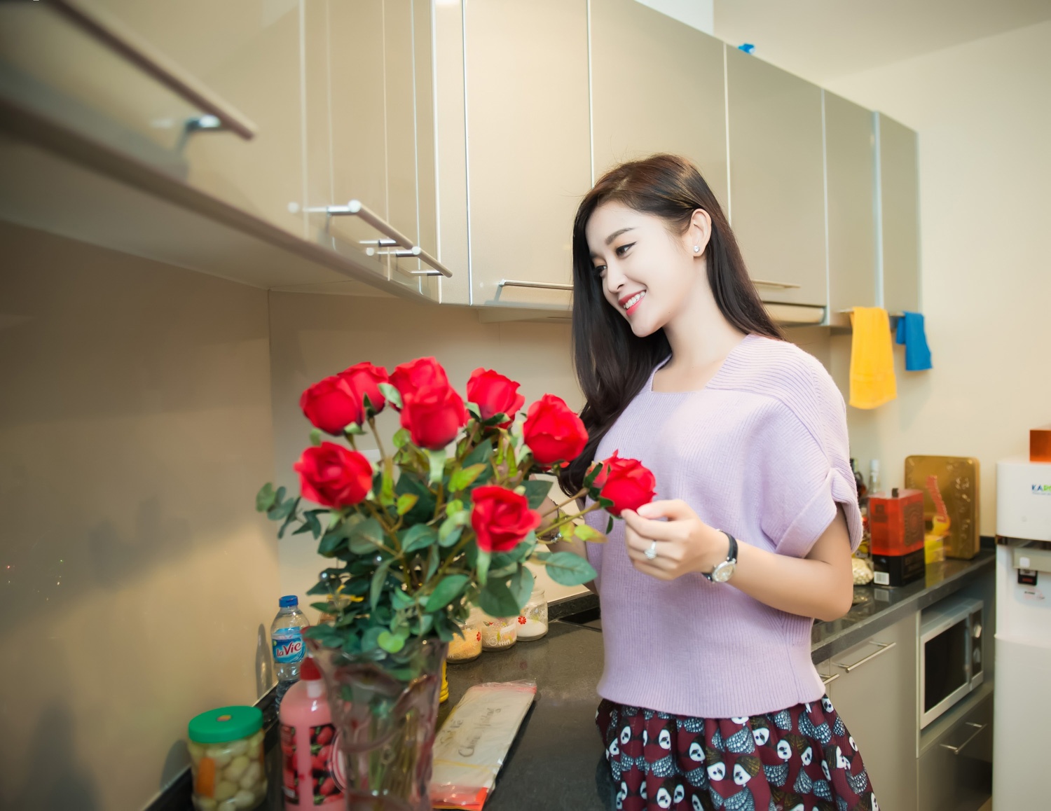 | Vốn có sở thích cắm hoa, khi dọn về nhà mới, á hậu đã mua rất nhiều loại hoa để trang trí khắp các phòng. Cô cho biết, hoa giúp các gian phòng thêm phần tươi tắn và lãng mạn. |