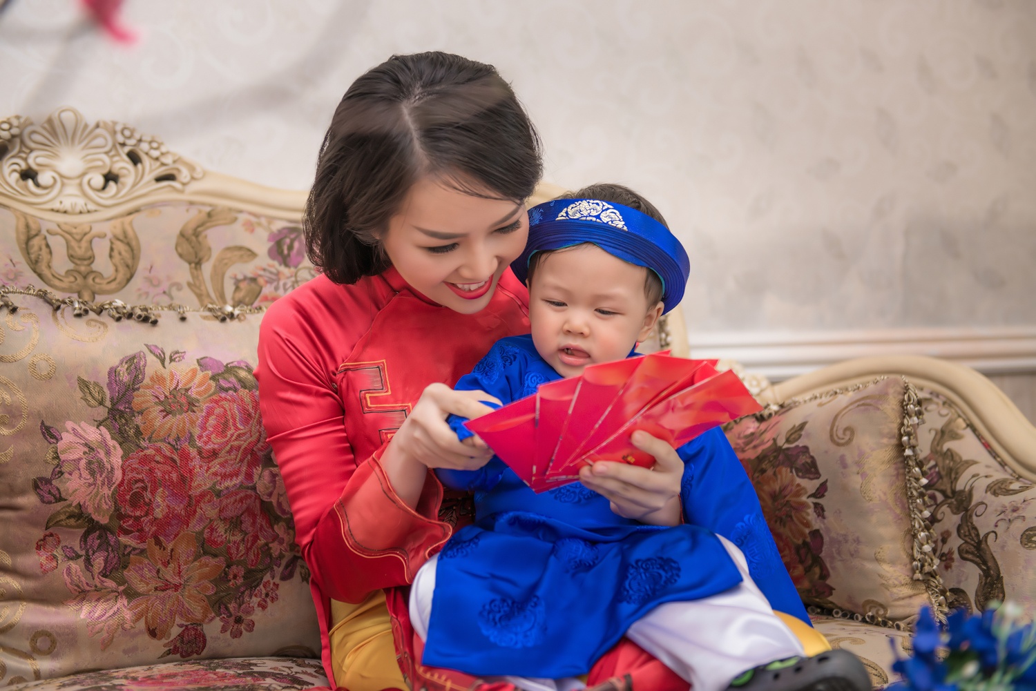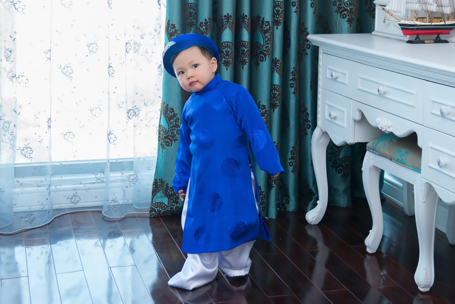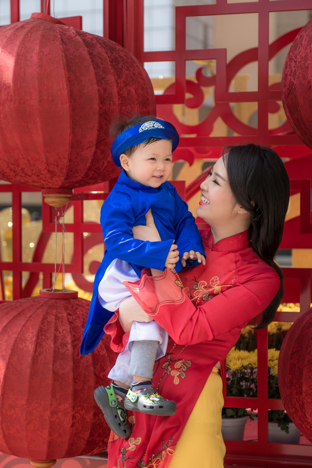 | Con trai của Thụy Vân có tên gọi thân mật ở nhà là Tony. Cậu nhóc mới được 1 tuổi rưỡi nhưng khá chững chạc. Trong những ngày giáp Tết, Tony được mẹ cho mặc áo dài, đội khăn đóng nên trông càng già dặn hơn. |