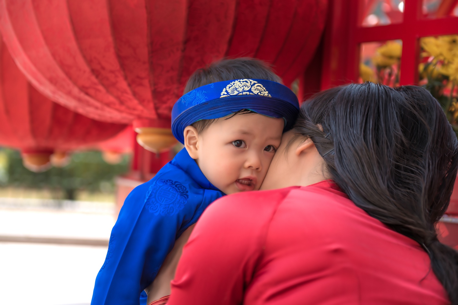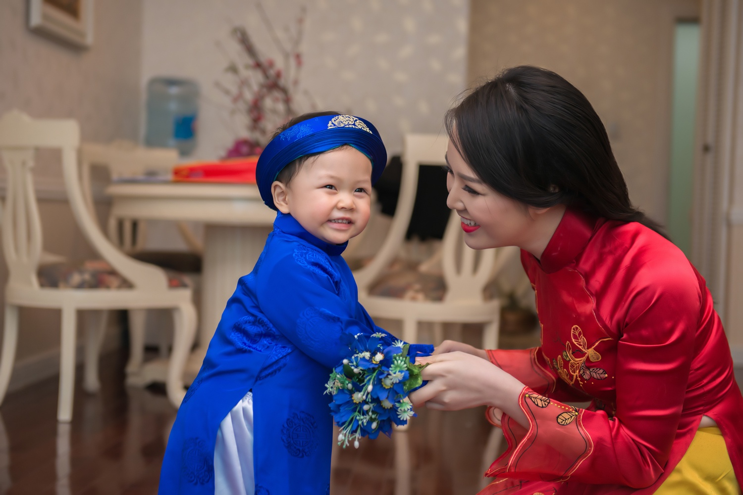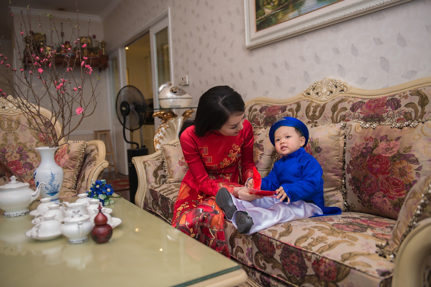 | Con trai của Thụy Vân có tên gọi thân mật ở nhà là Tony. Cậu nhóc mới được 1 tuổi rưỡi nhưng khá chững chạc. Trong những ngày giáp Tết, Tony được mẹ cho mặc áo dài, đội khăn đóng nên trông càng già dặn hơn. |