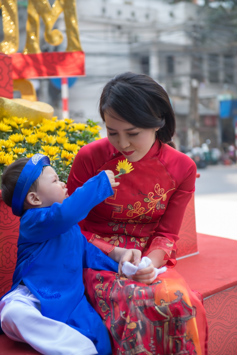 Người đẹp cùng cậu con trai 17 tháng tuổi xuống phố mua đào về chơi Tết và không quên thực hiện những shoot hình đẹp.