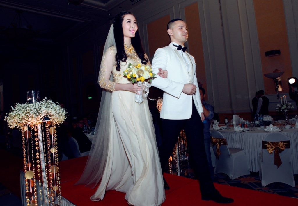 | Á hậu Việt Nam 2010 rạng rỡ theo chồng tiến vào khán phòng tổ chức tiệc cưới. |