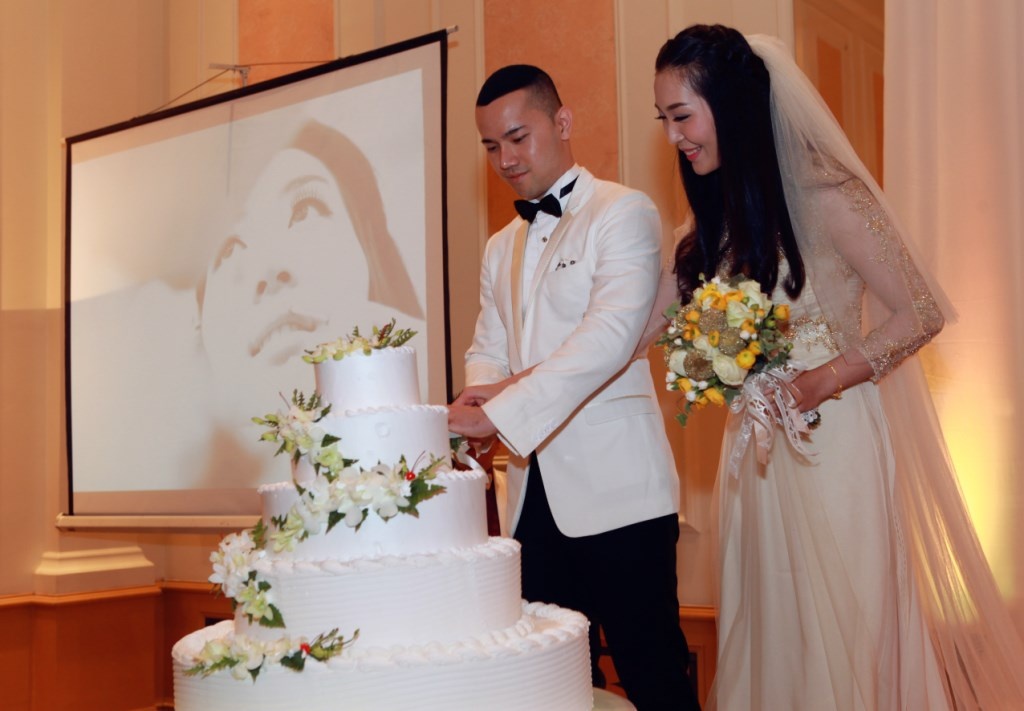 Thùy Trang khoác tay ông xã cắt bánh cưới...