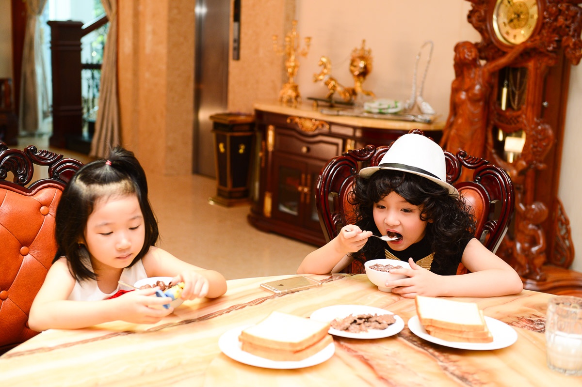 | Sau khi thay trang phục, ba mẹ con Trang Nhung cùng xuống nhà dùng bữa sáng. Nữ ca sĩ đất mỏ tập thói quen độc lập cho các con. Bích Ngọc và cô em gái tên Sóc tự chuẩn bị khẩu phần ăn cho mình. |