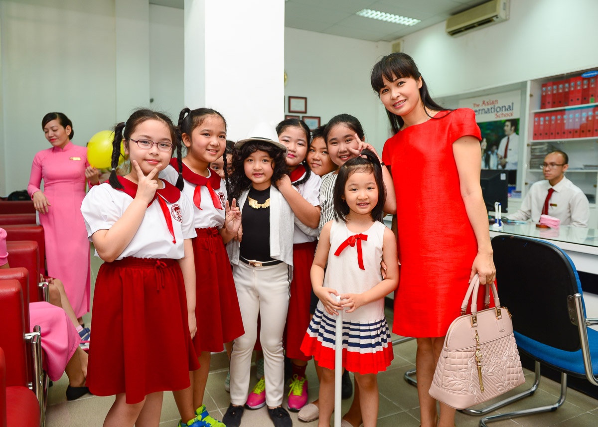 | Trang Nhung đưa con gái đến hội trường. Các bạn học cùng lớp trông thấy Bích Ngọc liền đến chụp hình cùng. |