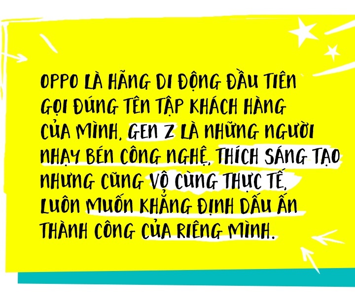 Oppo hiểu khách hàng của họ là những người sáng tạo, dẫn đầu xu thế và dám đón nhận thách thức. Nhưng gen Z cũng là những người rất thực tế. Họ thà làm tất cả để đạt được điều mình muốn chứ không mơ ước những thứ nghe có vẻ lãng mạn nhưng xa vời.