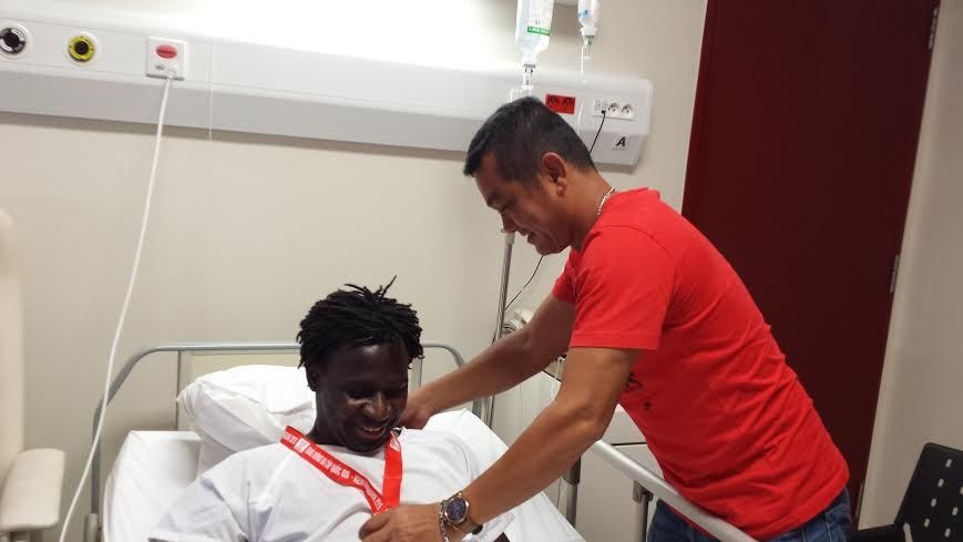 | Trưởng đoàn B.Bình Dương Nguyễn Thanh Quang đến trao huy chương Cup quốc gia cho Abass trên giường bệnh. |