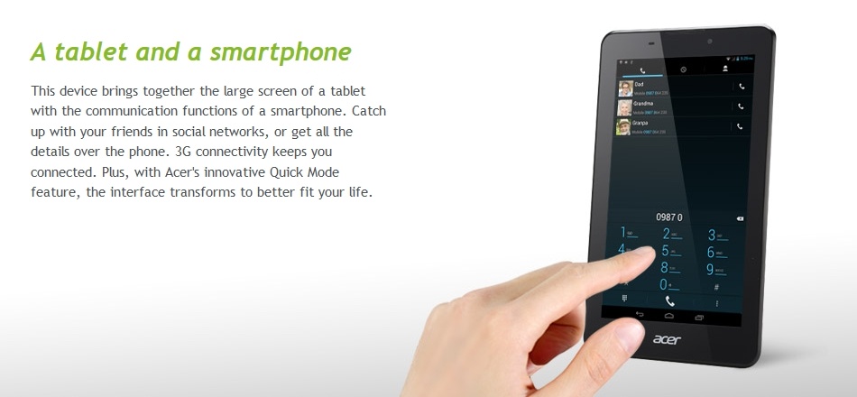 Iconia Tab 7, chiếc máy tính bảng còn lại của Acer được xem là "sự kết hợp giữa máy tính bảng và điện thoại" khi cung cấp chức năng gọi thoại và kết nối 3G.