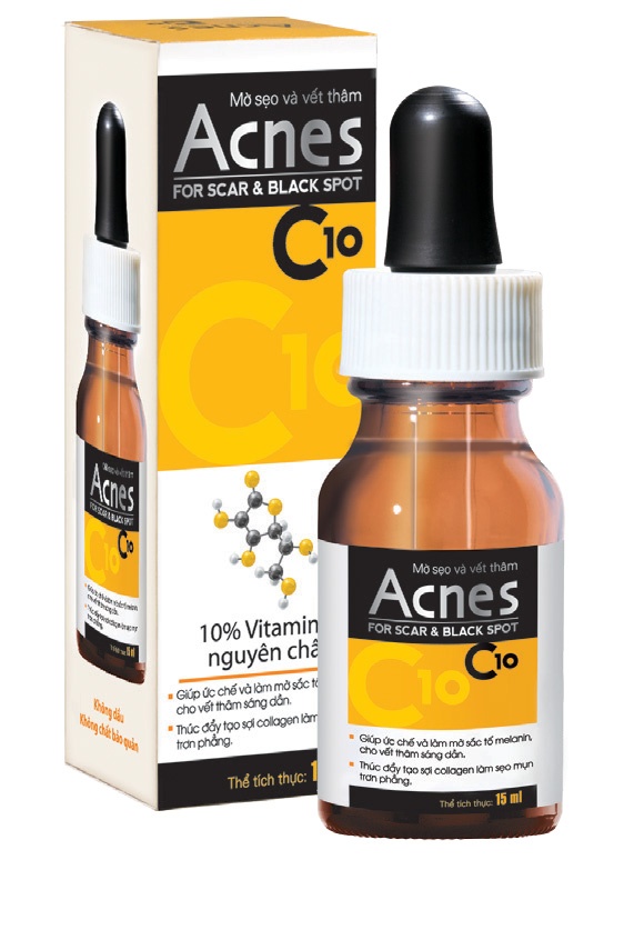 Acnes C10 chứa hàm lượng cao, 10% Vitamin C nguyên chất. Đây là thành quả sau nhiều năm nghiên cứu của Công ty Dược mỹ phẩm Rohto Nhật Bản. Nhờ công thức đặc biệt với thành phần vận chuyển Ethoxydiglycol mà vitamin C thẩm thấu sâu qua lớp thượng bì, tiếp xúc vào lớp trung bì. Khi ở lớp trung bì, vitamin C sẽ có tác dụng ngăn ngừa sự hình thành và làm mờ các sắc tố melanin, nhờ đó làm mờ các vết thâm. Vitamin C cũng thúc đẩy sự hình thành sợi elastin và collagen mới, từ đó liên kết collagen trở nên vững chắc, tạo điều kiện cho các khối cơ phát triển, sẹo lõm trên da dần đầy lại. Kết hợp với thành phần K giúp vitamin C ổn định, khó bị phân hủy và lọ đựng làm bằng nguyên liệu đặc biệt, giảm thiểu tối đa tác hại của ánh nắng và bảo quản tốt hơn. Ngoài ra, Acnes C10 còn hỗ trợ điều trị nám và tàn nhang.