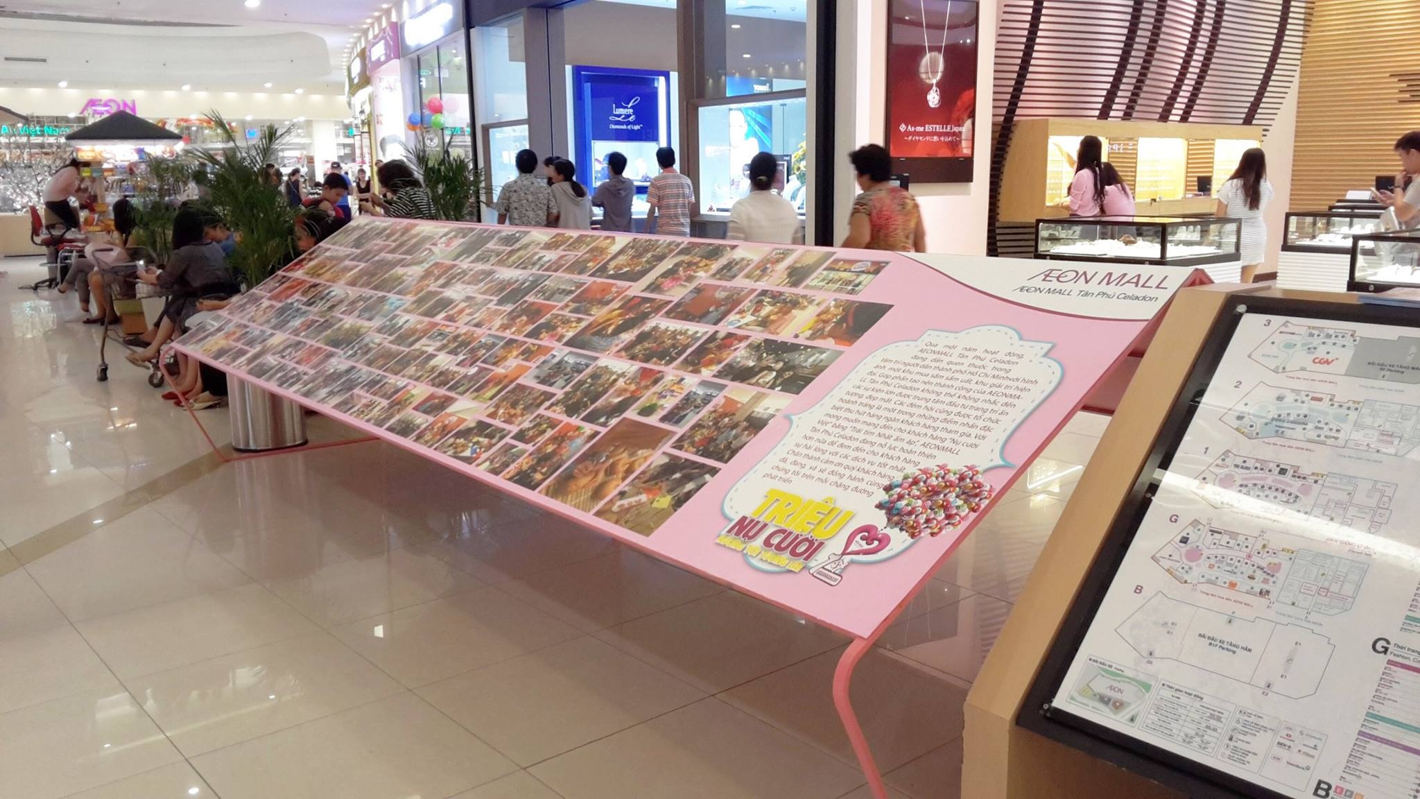 Sau một năm hoạt động nhằm tri ân khách hàng Việt đã ủng hộ trung tâm mua sắm AEON MALL Tân Phú Celadon. AEON MALL đã thực hiện chuỗi chương trình kỷ niệm độc đáo mang thông điệp chính “Triệu nụ cười hướng tới tương lai”, với rất nhiều hoạt động hấp dẫn như thực hiện trang trí toàn bộ khu trung tâm mua sắm với hàng trăm chùm bóng bay khổng lồ treo tại các sảnh lớn của trung tâm thương mại, những bức tranh Triệu nụ cười hướng tới tương lai được ghép bởi hình ảnh của triệu khách hàng đã đến AEON MALL Tân Phú Celadon trong năm được đặt dọc theo các hành lang hay những.