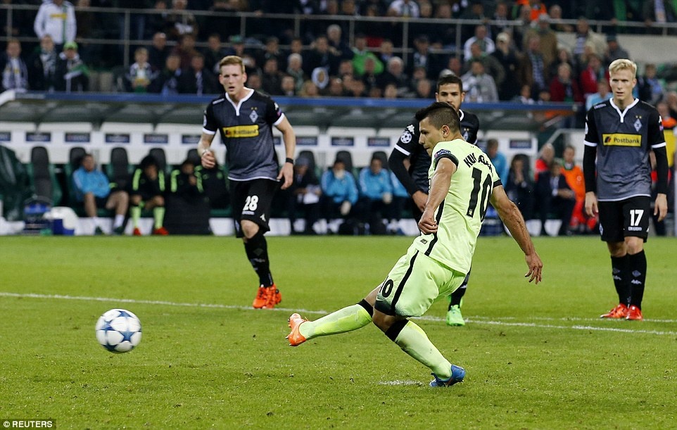 | Cú sút chính xác trên chấm 11 m của Aguero vào lưới Monchengladbach phút 90 không chỉ giúp El Kun giải tỏa cơn hạn bàn thắng, mà còn giúp Man City thắng trận đầu tiên tại Champions League mùa này. |