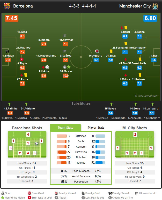 71': Messi chuyền bóng tinh tế để Neymar băng vào dứt điểm. Sau khi Joe Hart đẩy ra, Alba băng vào sút bồi tung lưới Man City. Tuy nhiên, trọng tài không công nhận bàn thắng vì cho rằng Alba việt vị.