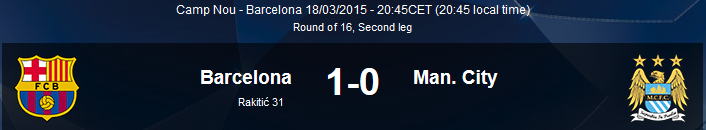 Chung cuộc, Man City thua 0-1 sau pha ghi bàn duy nhất của Rakitic ở phút 31. "Man xanh" là đại diện cuối cùng của bóng đá Anh bị loại khỏi Champions League mùa này với thất bại 1-3 sau hai lượt trận.