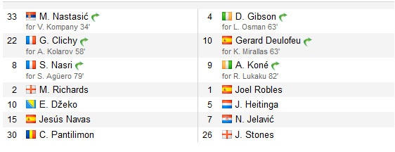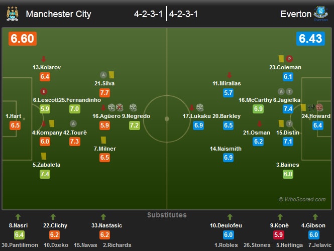 Trong khoảng thời gian còn lại, trận đấu liên tục bị gián đoạn sau những pha phạm lỗi của cầu thủ hai đội. Trọng tài Jon Moss đã rút tới 6 thẻ vàng kể từ phút 70 cho đến cuối trận để cảnh cáo cầu thủ của Man City và Everton. Với việc bảo toàn chiến thắng 3-1, thầy trò HLV Pellegrini có 13 điểm sau 7 vòng đấu.